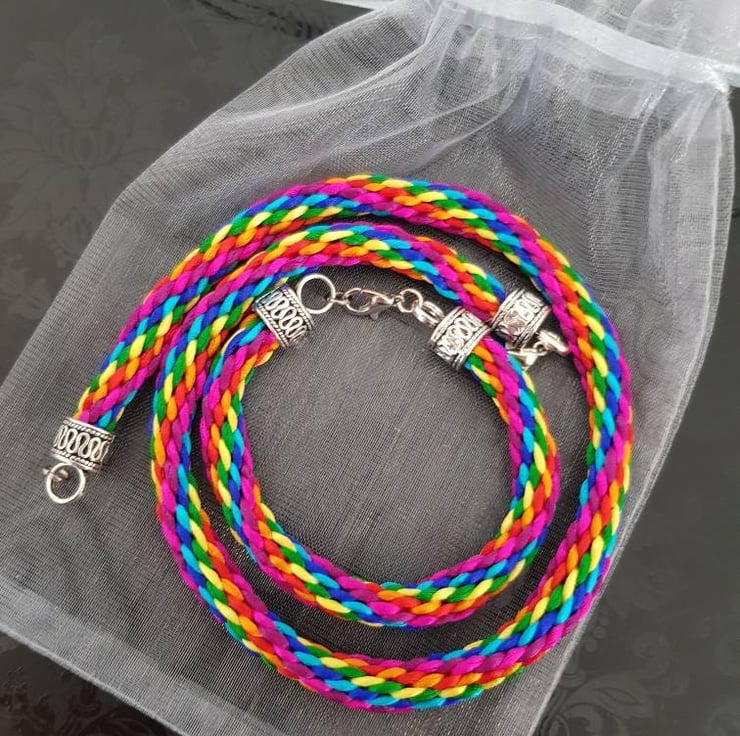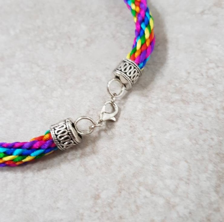 Hand woven with 16 strands of 1mm rattail silk cord and finished with a decorative Tibetan silver lobster clasp. These colourful accessories are all individually braided and completely unique. Girlfriend, sister, daughter or bestie, who doesn't love a rainbow!