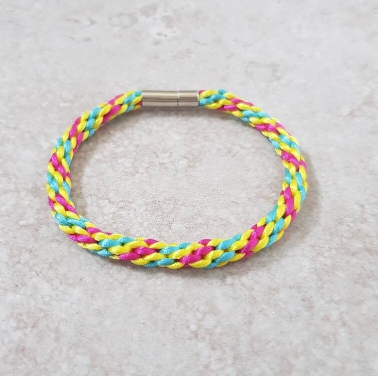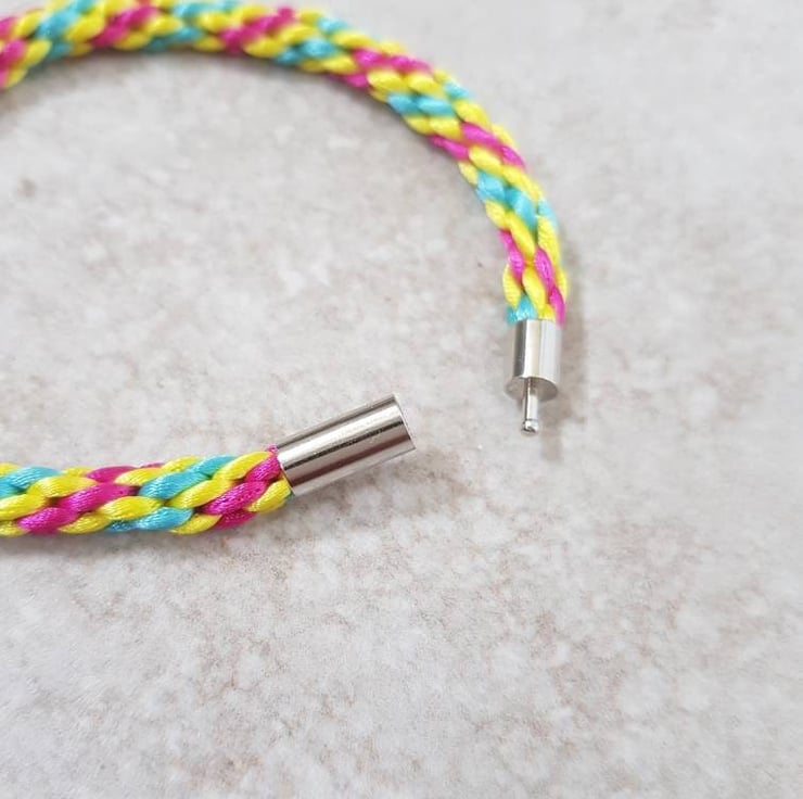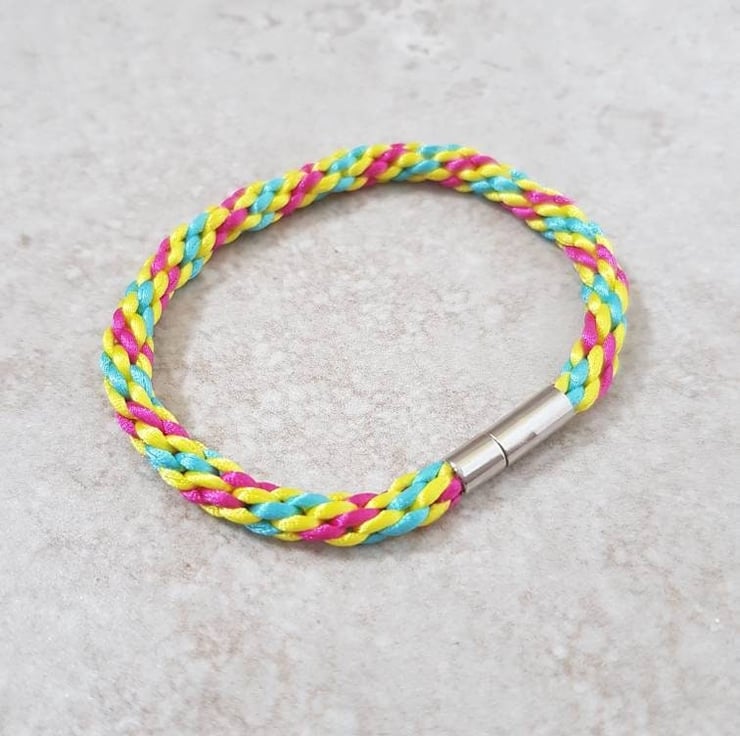 This listing is for ONE blue, pink and yellow bracelet with bayonet clasp.