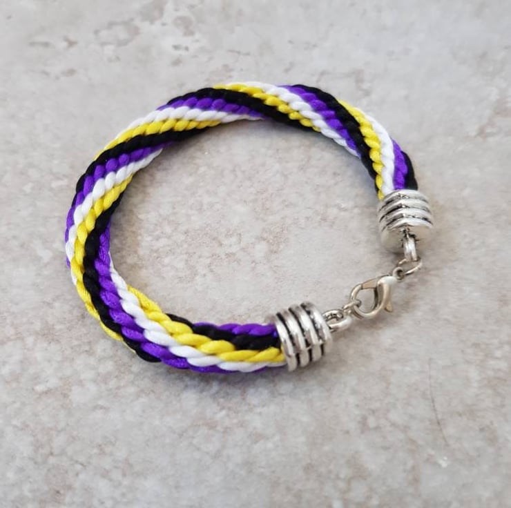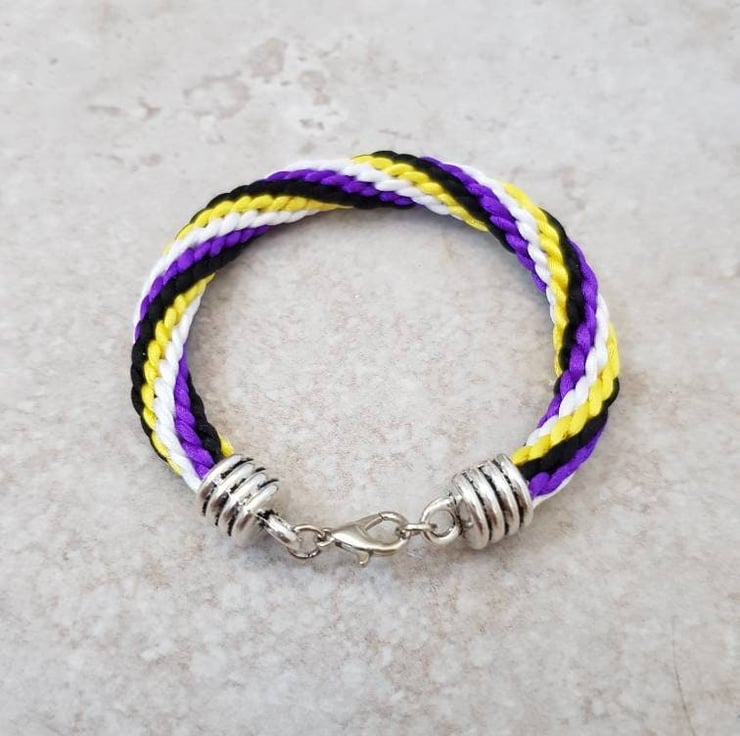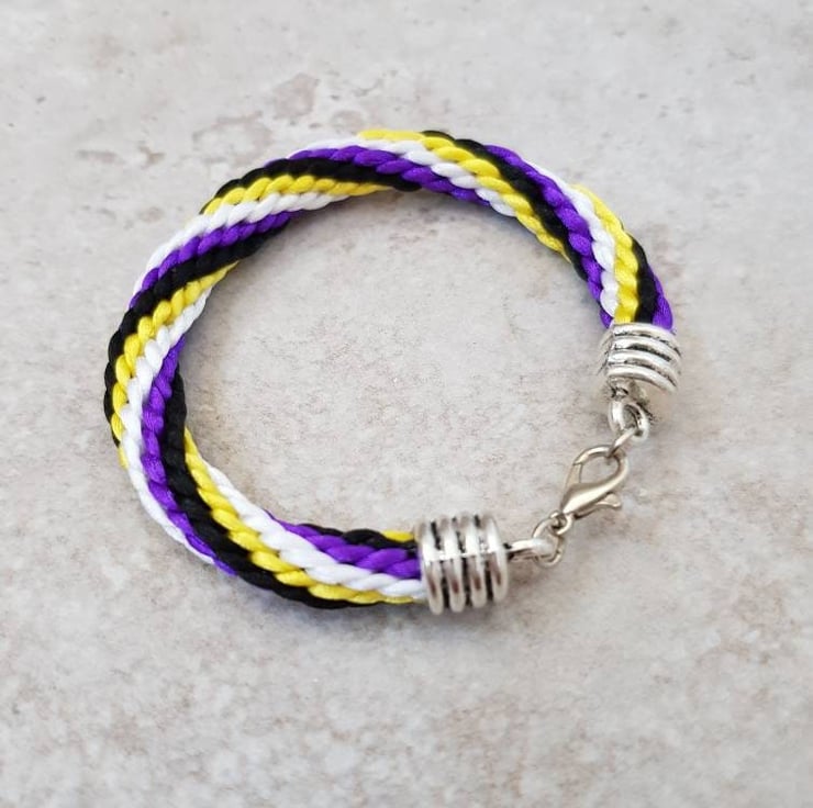 This listing is for ONE black, purple, yellow and white non binary bracelet only.