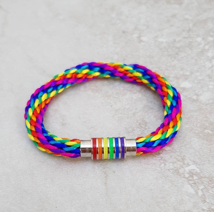 Handbraided with silky vegan friendly rattail cord and finished with a rainbow stripe, silver tone magnetic clasp.