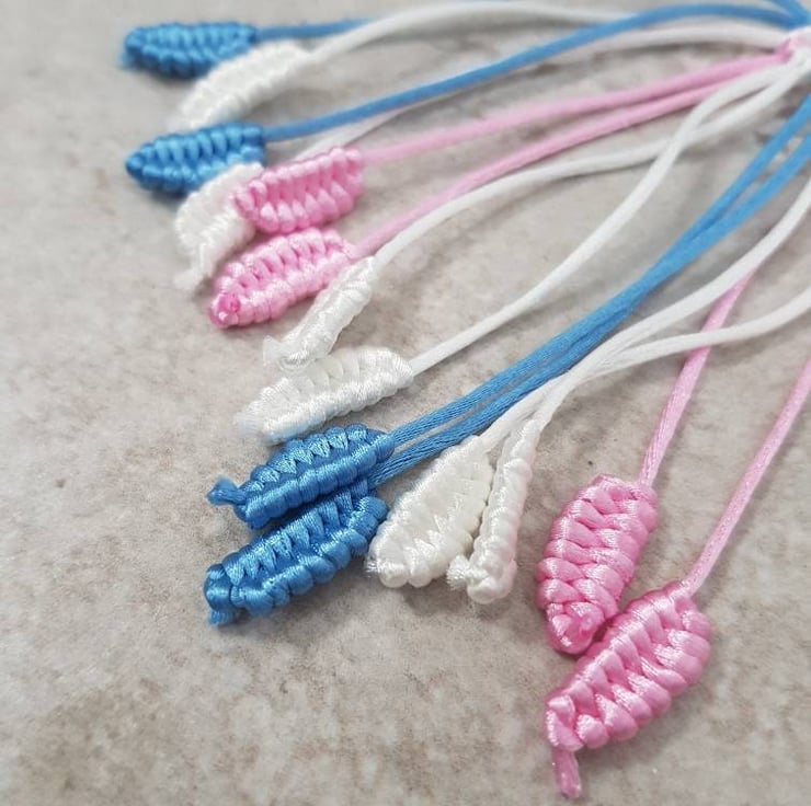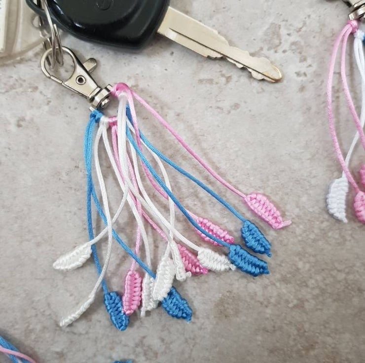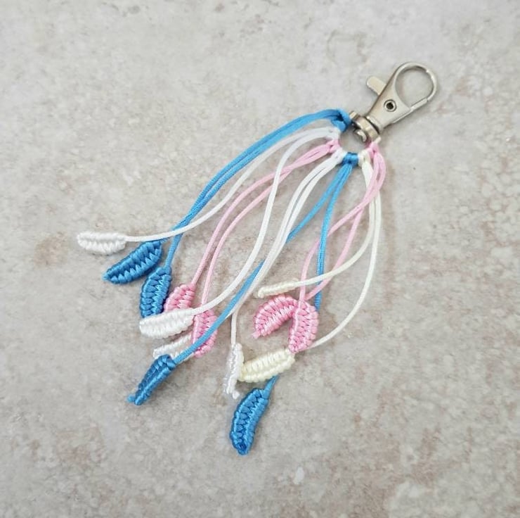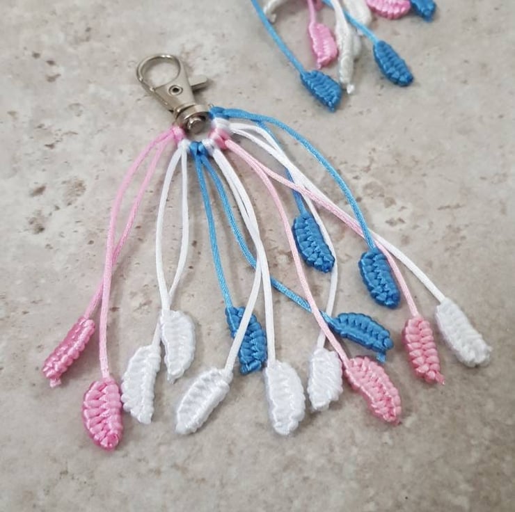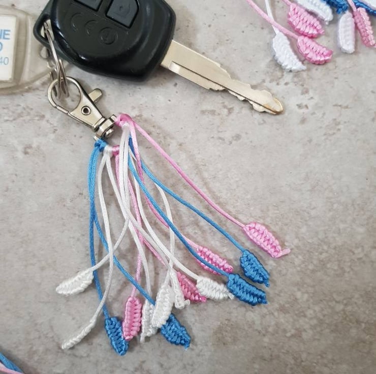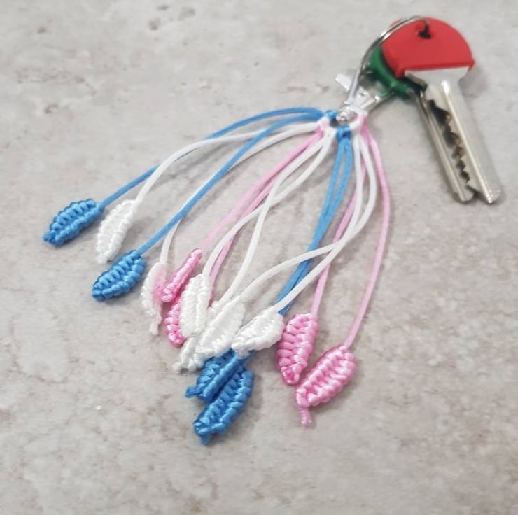 This pink, blue and white key charm is hand knotted on silky soft 1mm rattail cord.