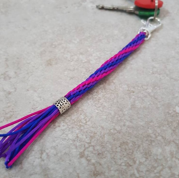 This colourful keyring or bag charm is hand braided with 16 strands of silky nylon satin cord attached to a silver tone clip. A brightly coloured tassel and decorative Tibetan silver bead complete this cute little key chain.
