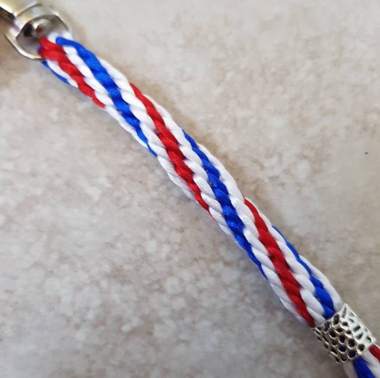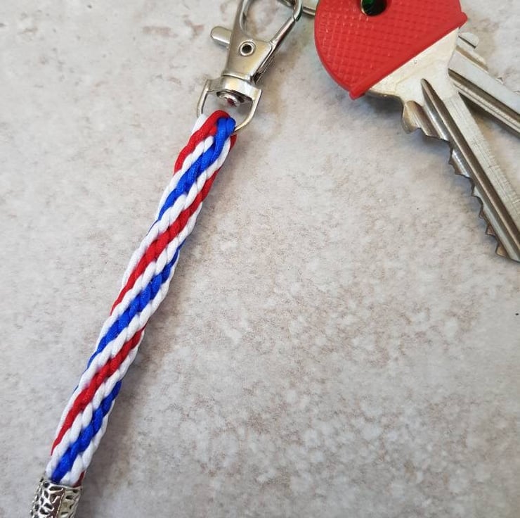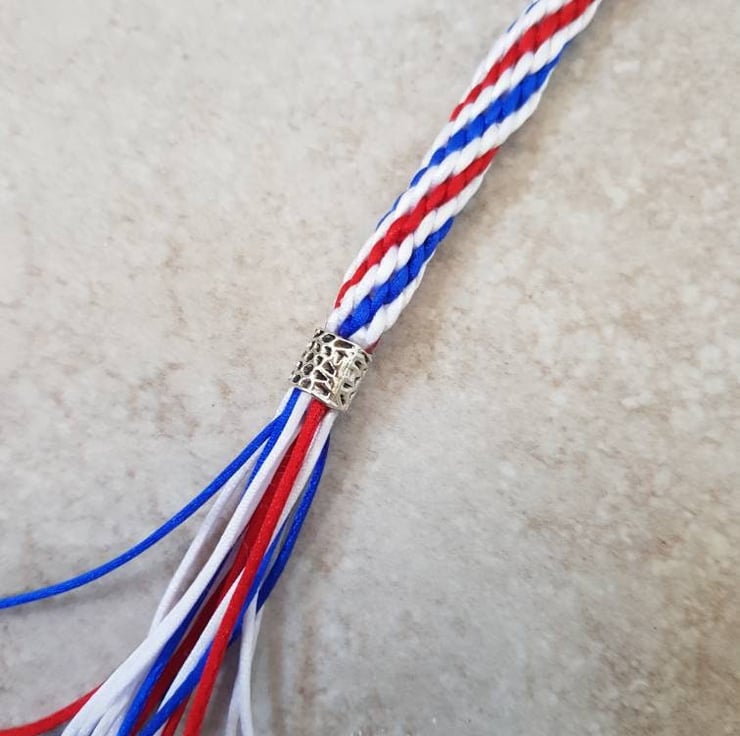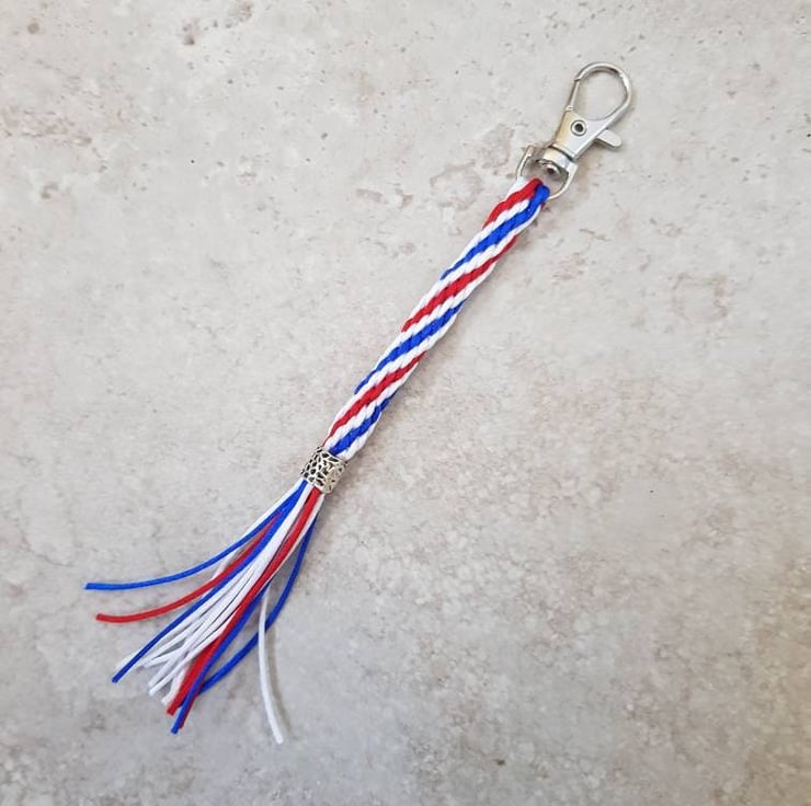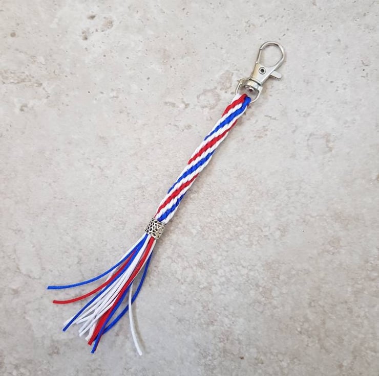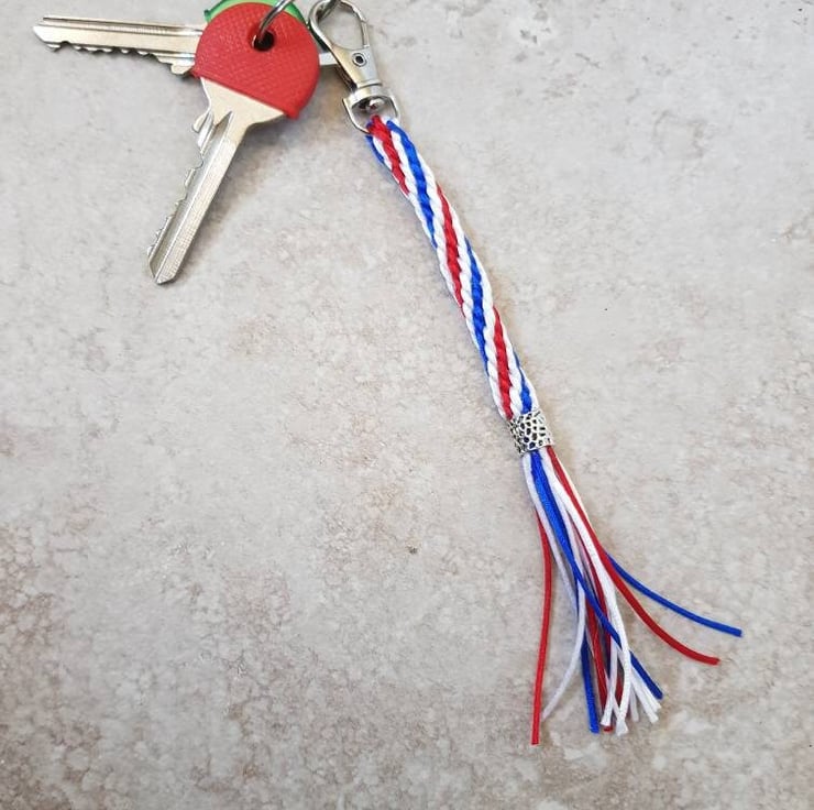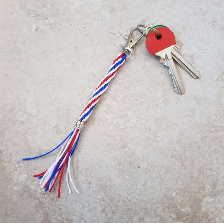 This colourful little keyring or bag charm is hand braided with 16 strands of silky nylon cord attached to a silver tone clip. A brightly coloured tassel and decorative Tibetan silver bead complete this cute little key chain.