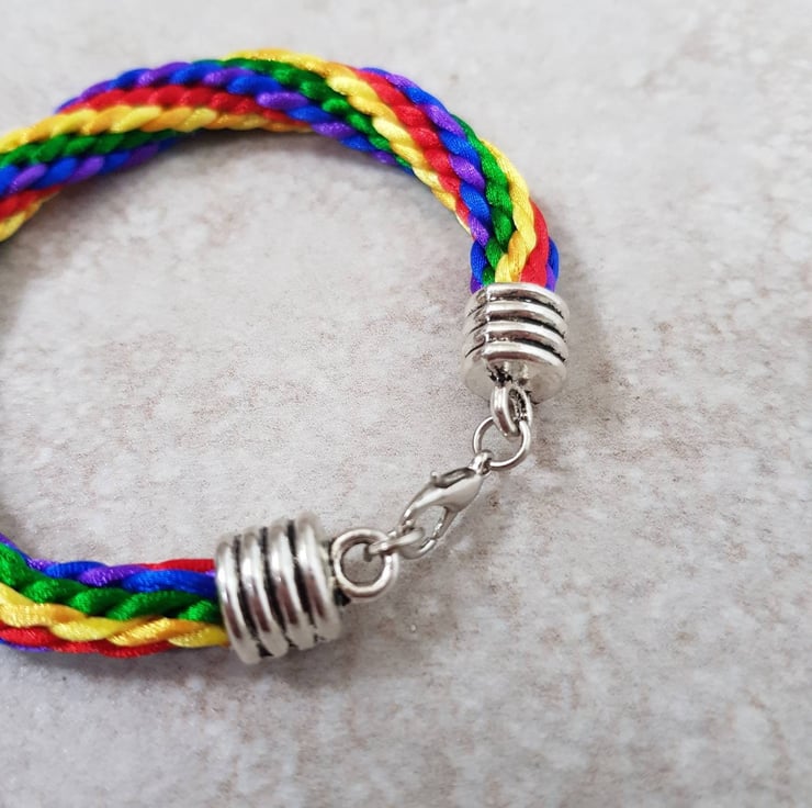 Rainbow lovers! Festival Goers! Colour Addicts! This colourful Rainbow Bracelet is handwoven in a rainbow stripe pattern with colourful rattail silk cord and finished with a silver coloured lobster clasp.