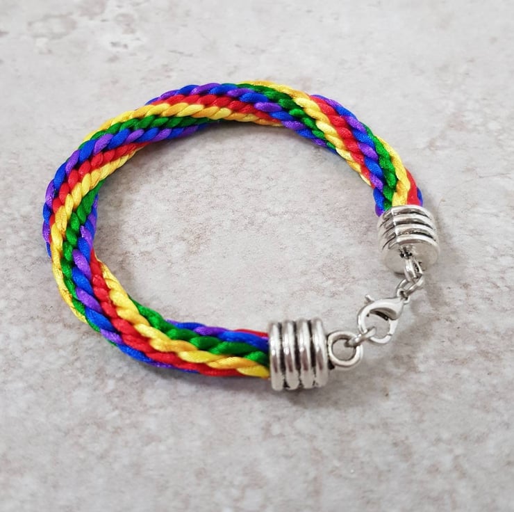 Rainbow lovers! Festival Goers! Colour Addicts! This colourful Rainbow Bracelet is handwoven in a rainbow stripe pattern with colourful rattail silk cord and finished with a silver coloured lobster clasp.