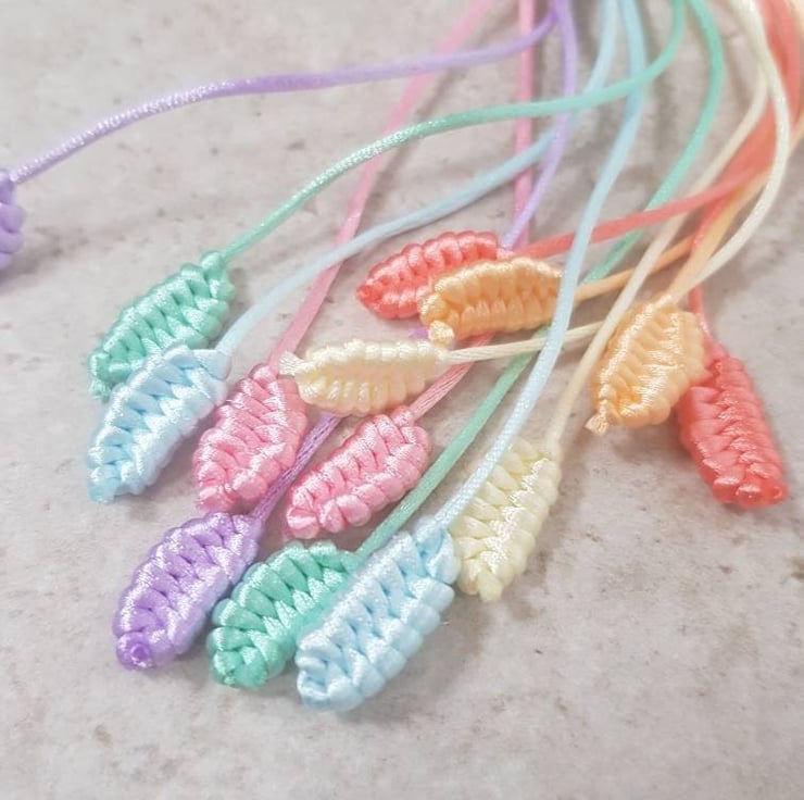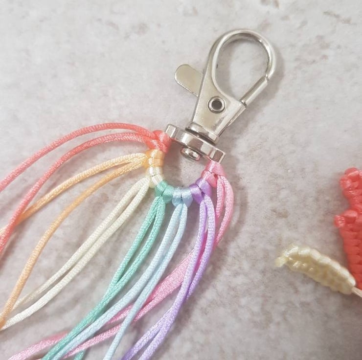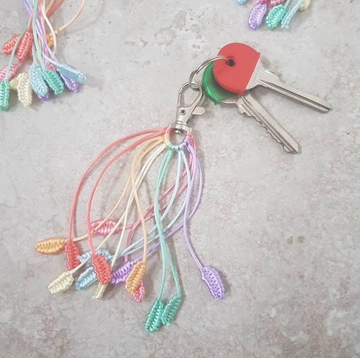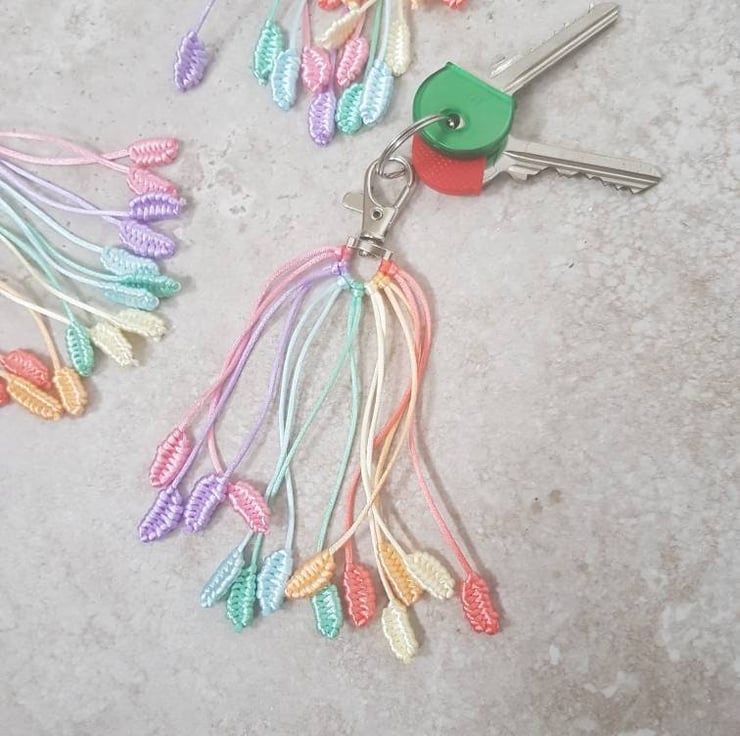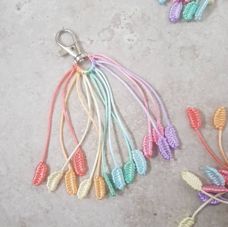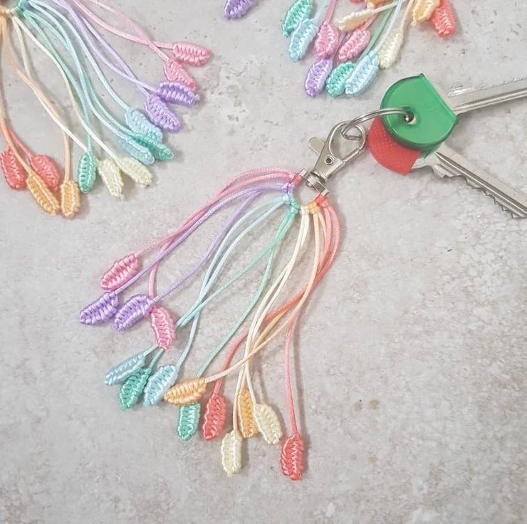 This pretty Pastel Rainbow coloured key charm is hand knotted in silky soft rattail cord.