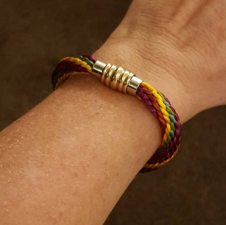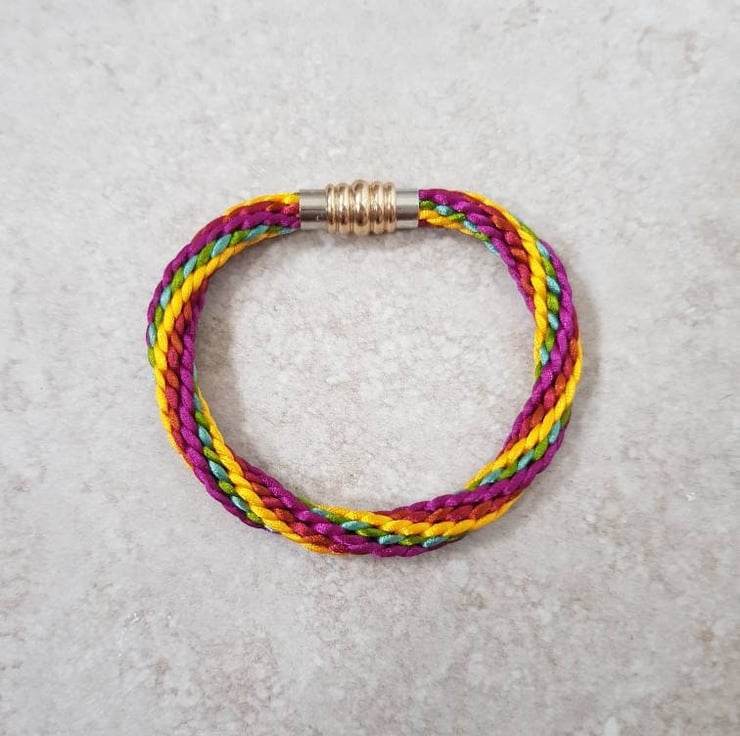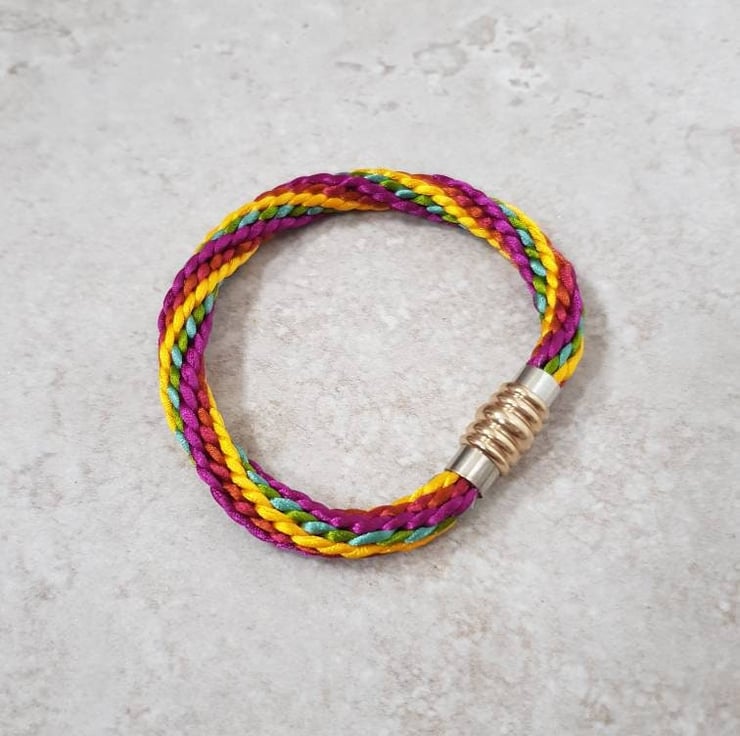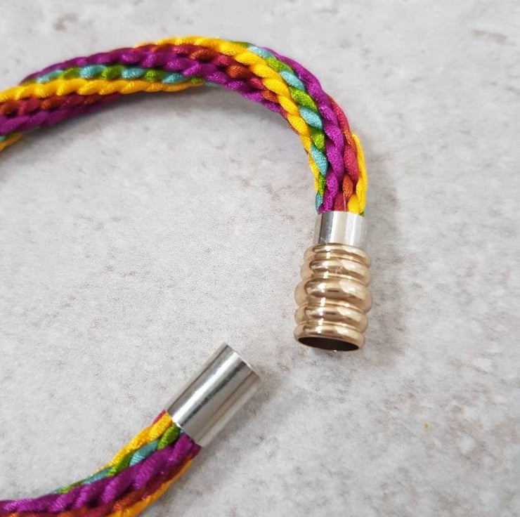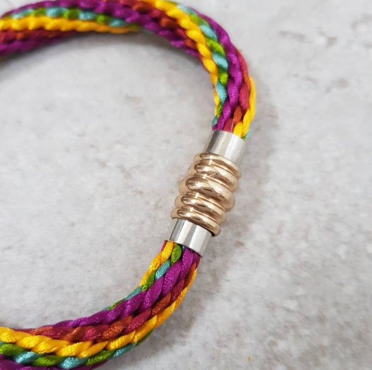 Handwoven in jewel shades of burgundy, copper, teal, olive and golden yellow, silky rattail cord finished with an elegant gold and silver coloured magnetic clasp.