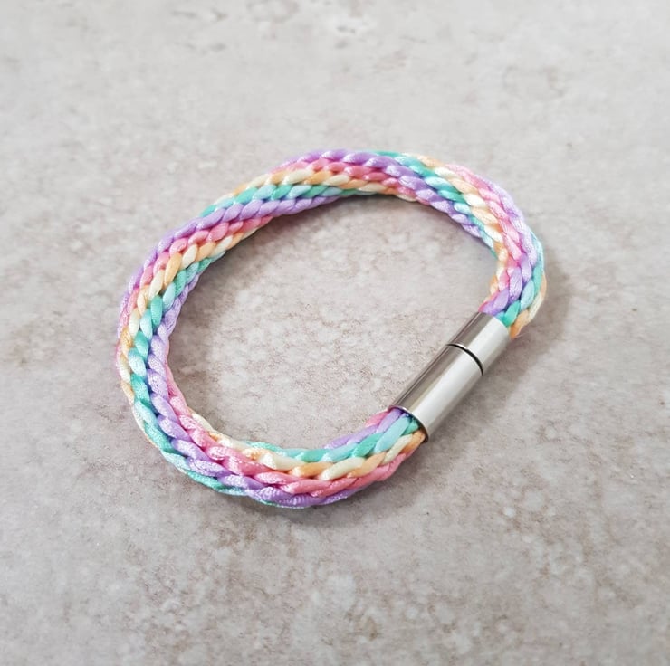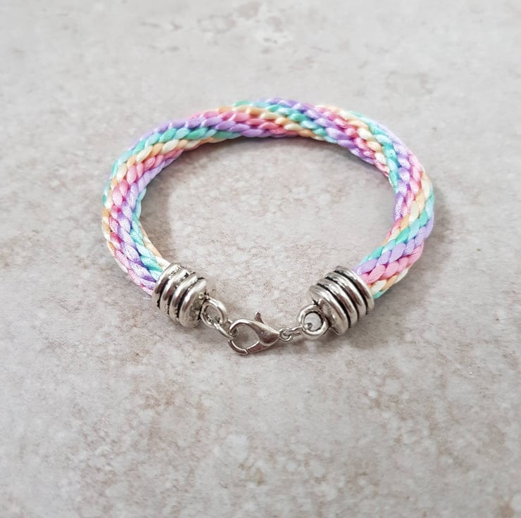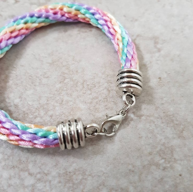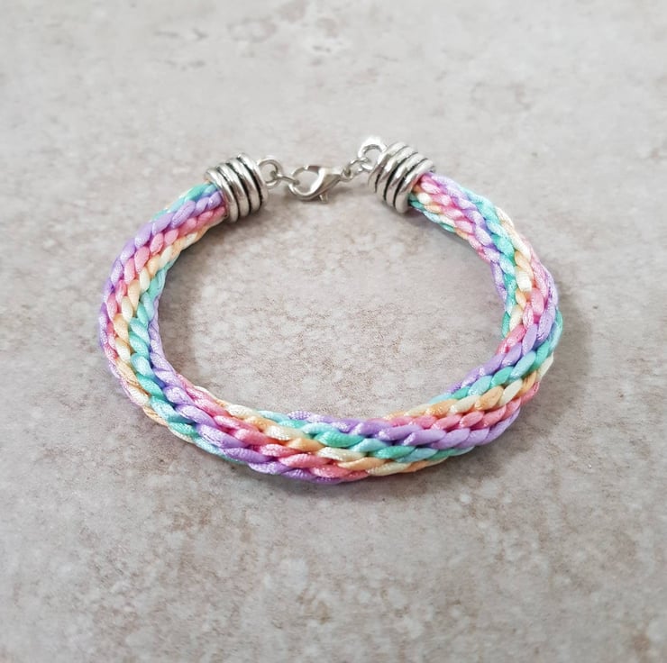 Rainbow lovers! Festival Goers! Princesses and Pastel goths! This pretty pastel rainbow bracelet is hand woven with delicate rattail silk and finished with a silver tone lobster clasp.