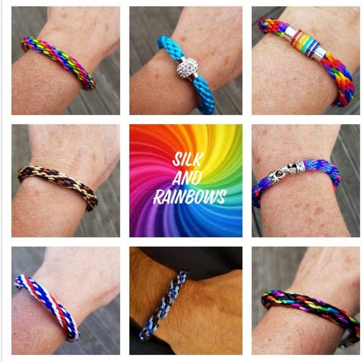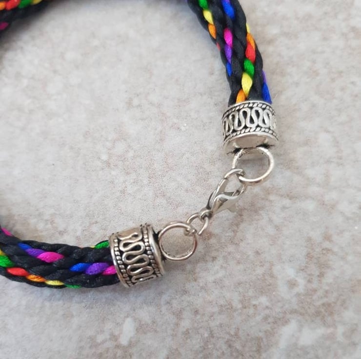 This beautiful black bracelet pops with a rainbow of colour. Handwoven with 16 strands of rattail silk and finished with a Tibetan silver lobster clasp.