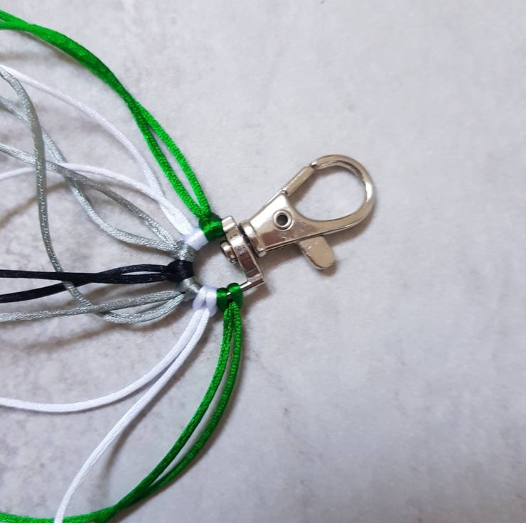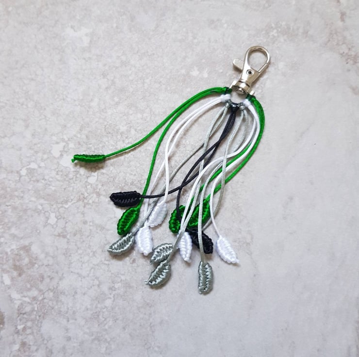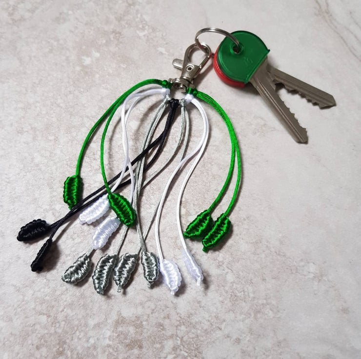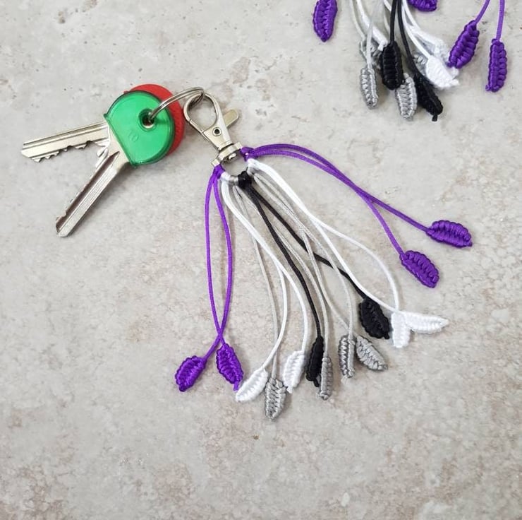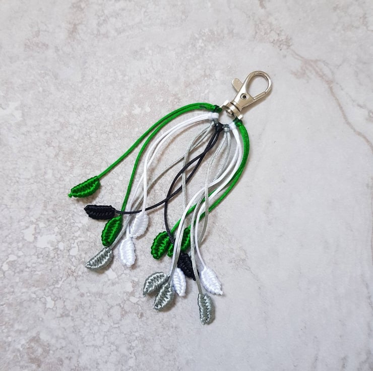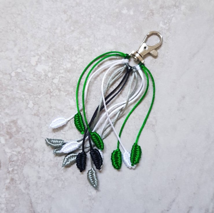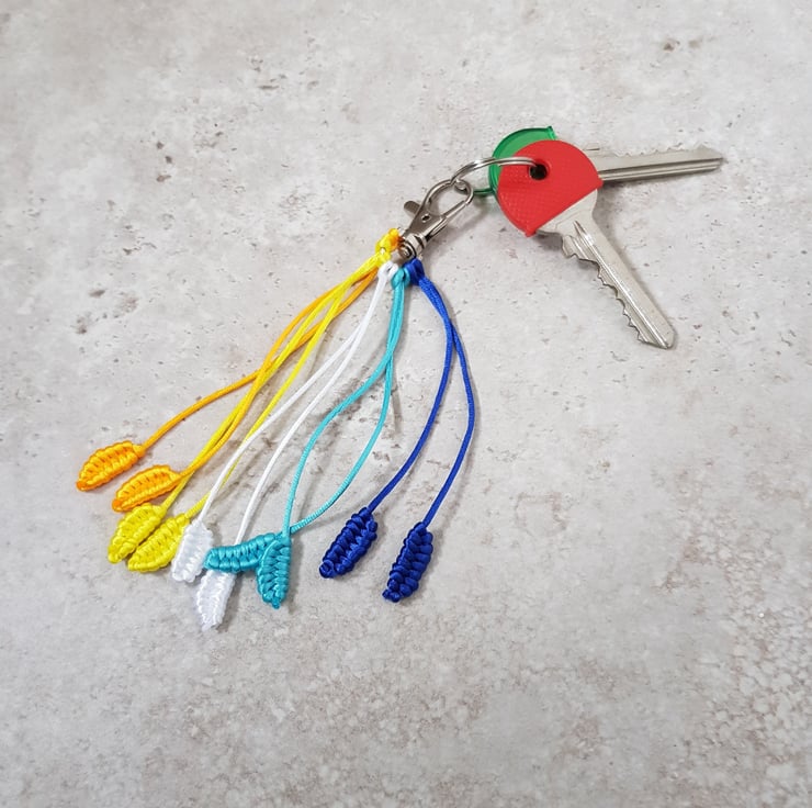 This colourful Pride flag keyring or bag charm is handknotted with 14 strands of silky nylon satin cord attached to a silver tone clip.