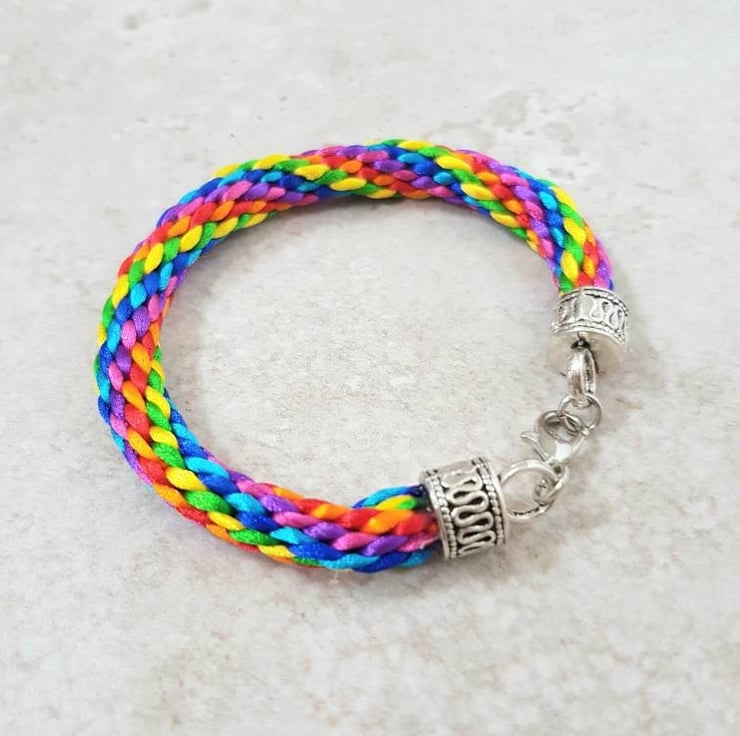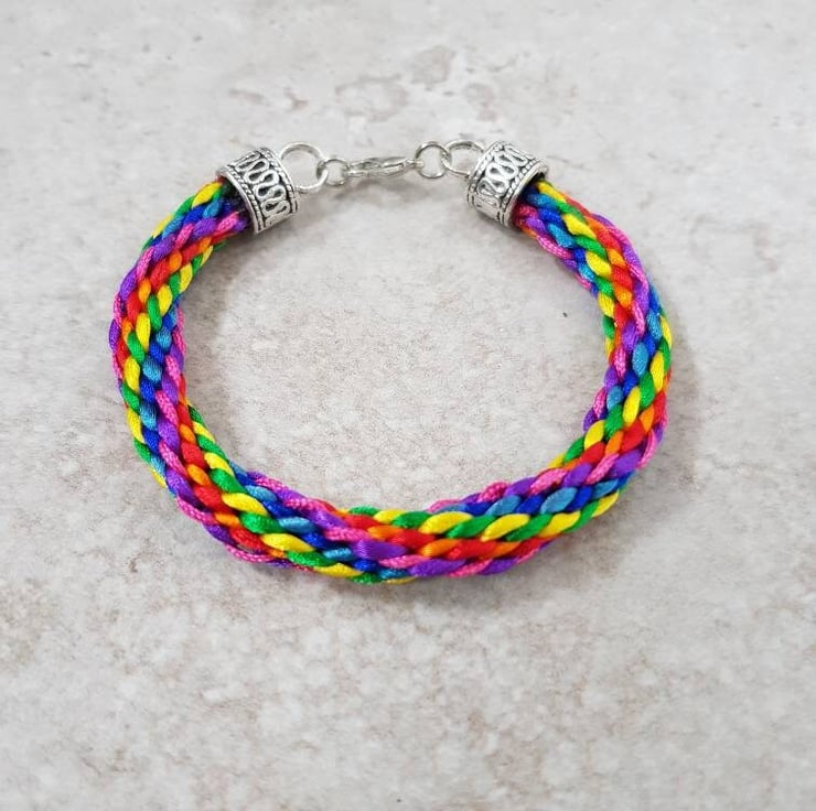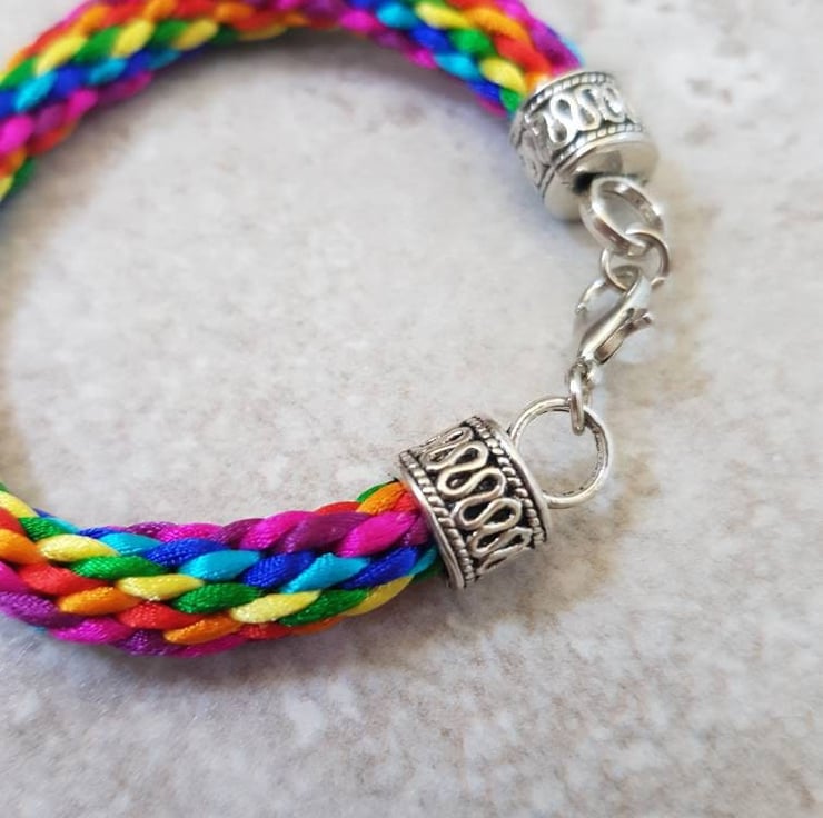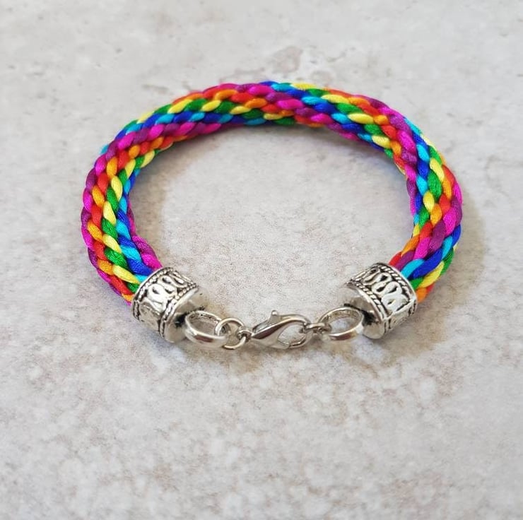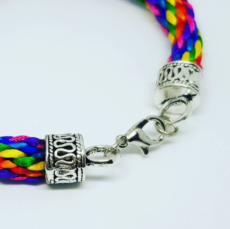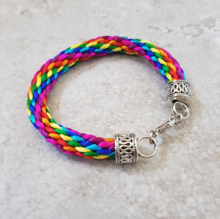 This colourful Rainbow Bracelet is Hand braided with bright rattail silk and finished with a silver coloured Tibetan style lobster clasp.