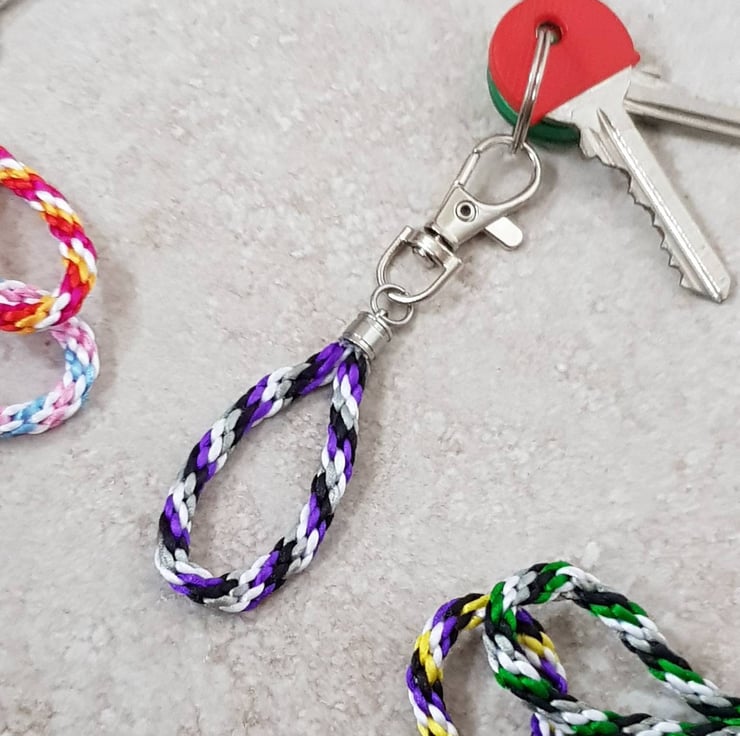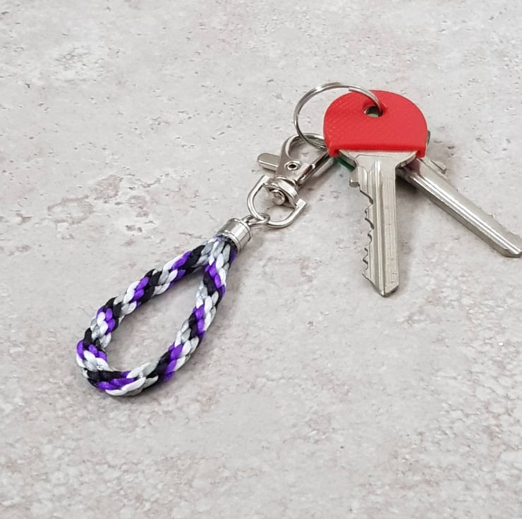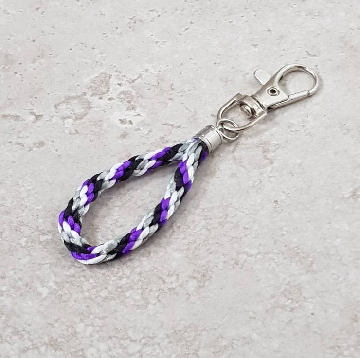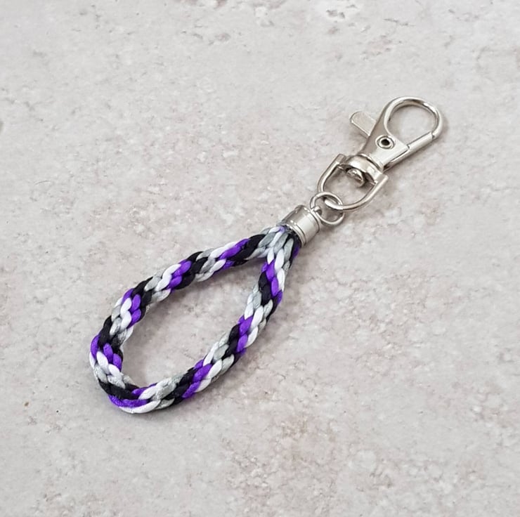This macrame loop Asexual flag keyring or bag charm is handknotted with silky nylon satin cord attached to a silver tone clip.