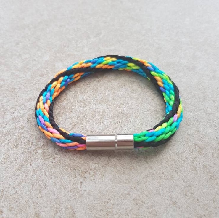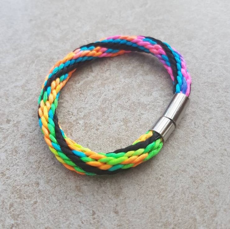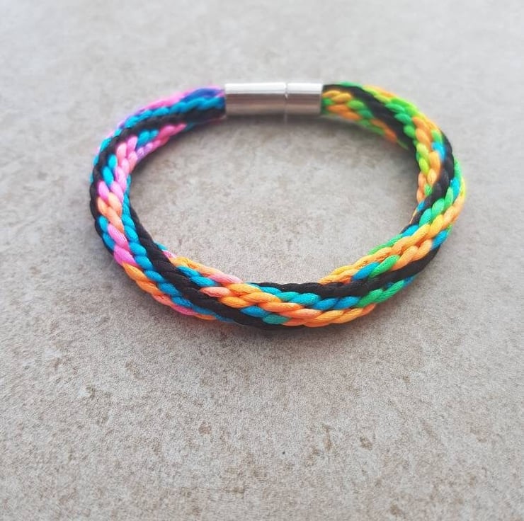 Festival Goers! Colour Addicts! 80s kids! This colourful braided bracelet is handwoven in rattail silk and finished with a secure bayonet clasp.