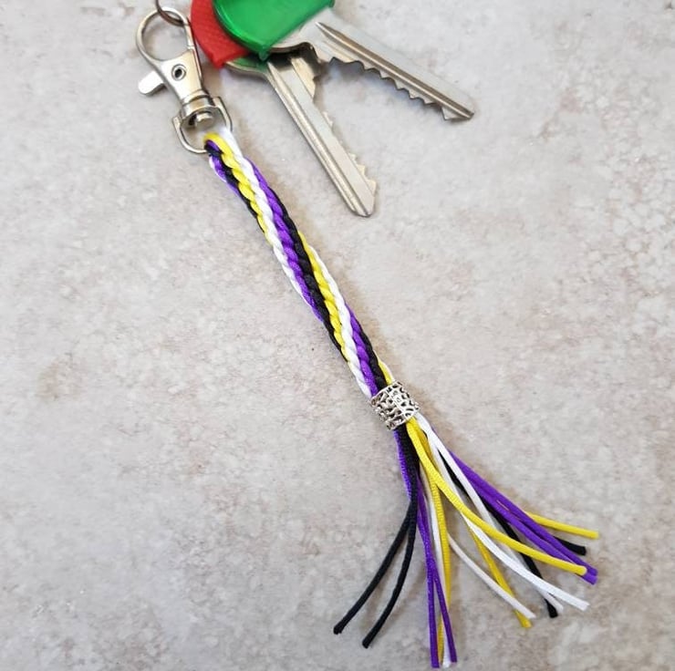 This colourful keyring or bag charm is hand braided with 16 strands of silky nylon satin cord attached to a silver tone clip. A brightly coloured tassel and decorative Tibetan silver bead complete this cute little key chain.