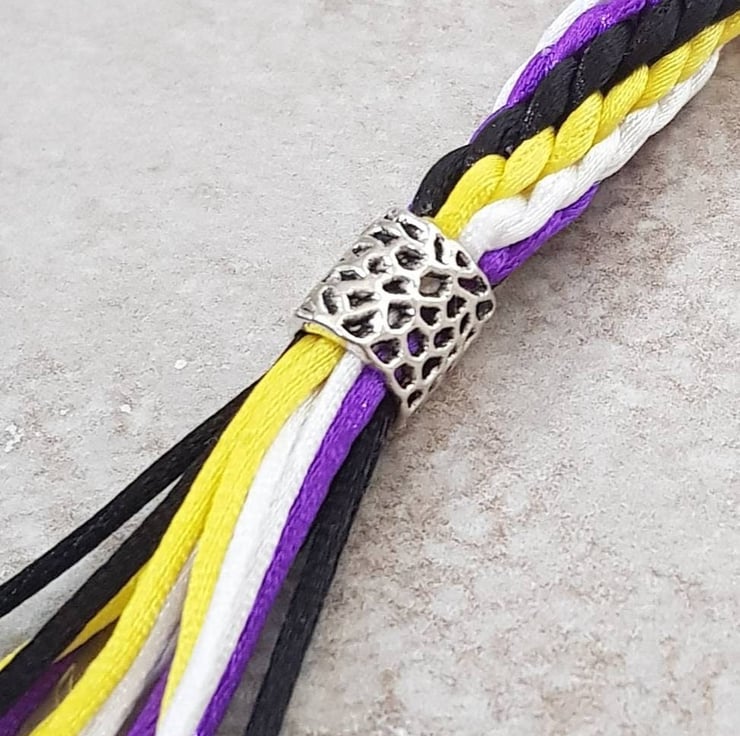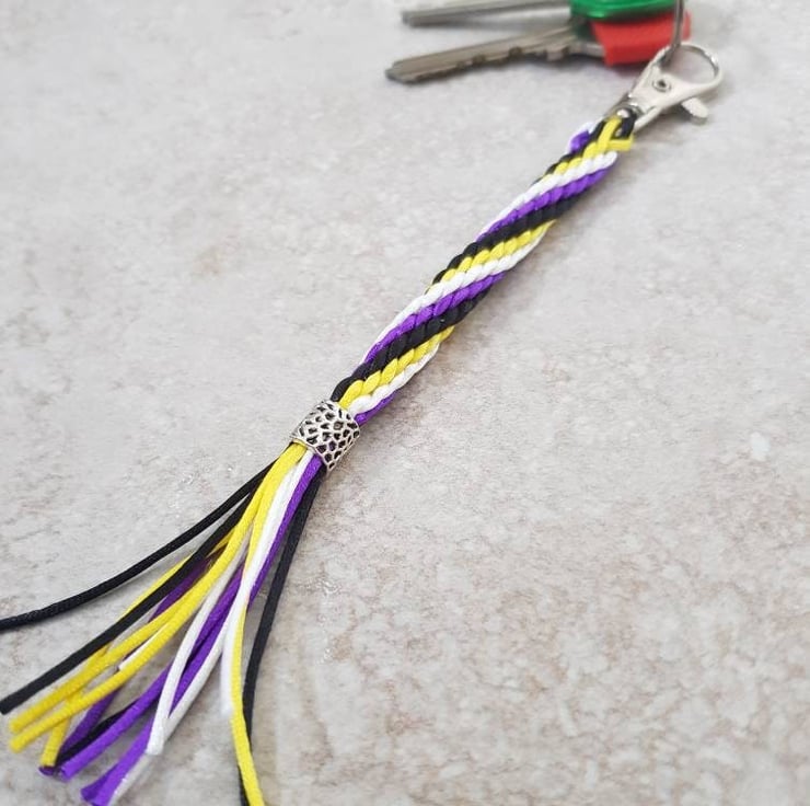 This colourful keyring or bag charm is hand braided with 16 strands of silky nylon satin cord attached to a silver tone clip. A brightly coloured tassel and decorative Tibetan silver bead complete this cute little key chain.