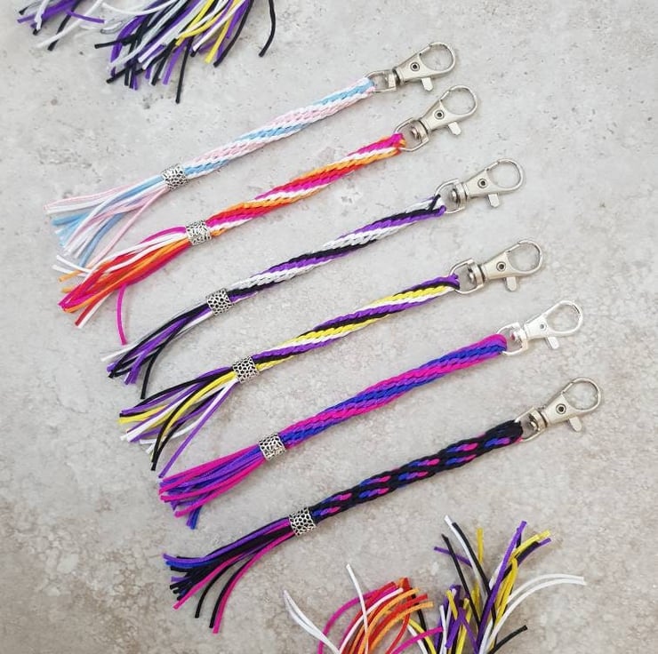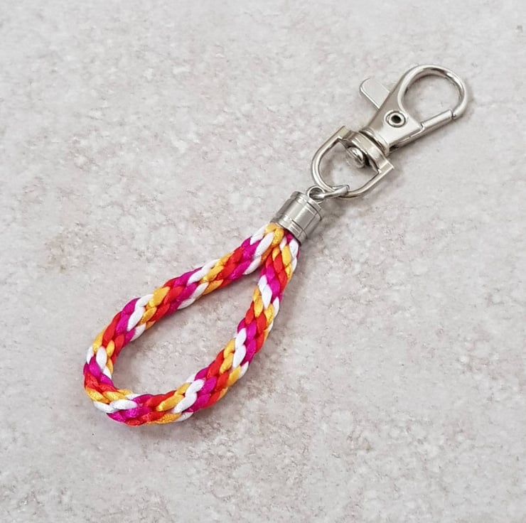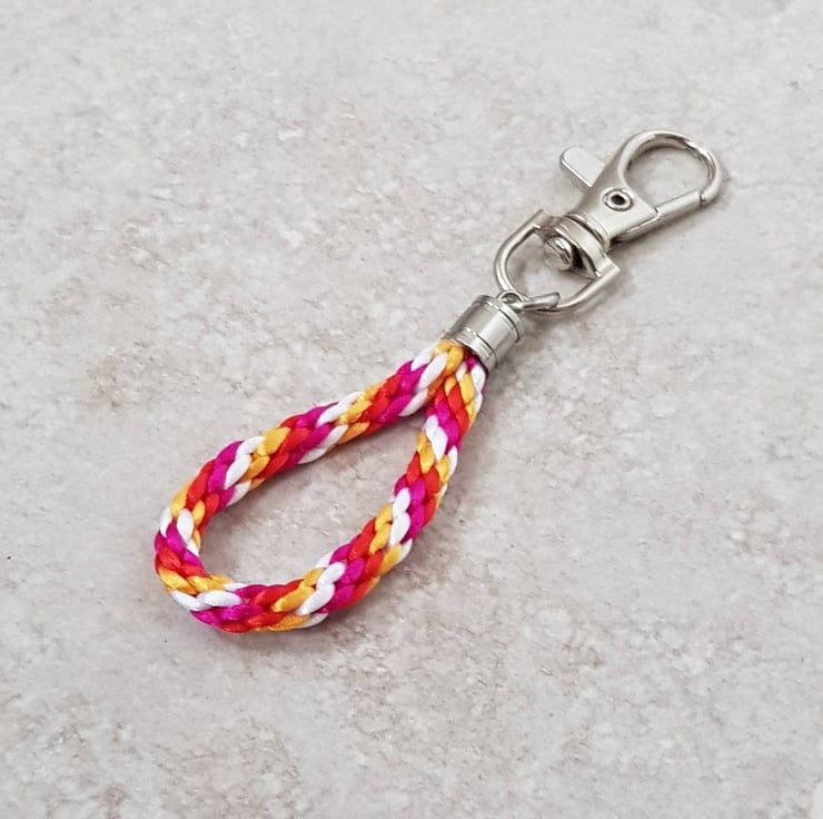 This colourful little keyring or bag charm is hand braided with silky nylon cord on a silver tone clip.
