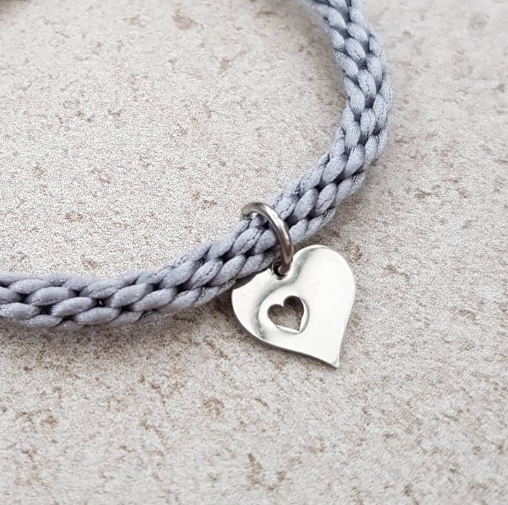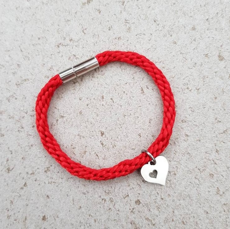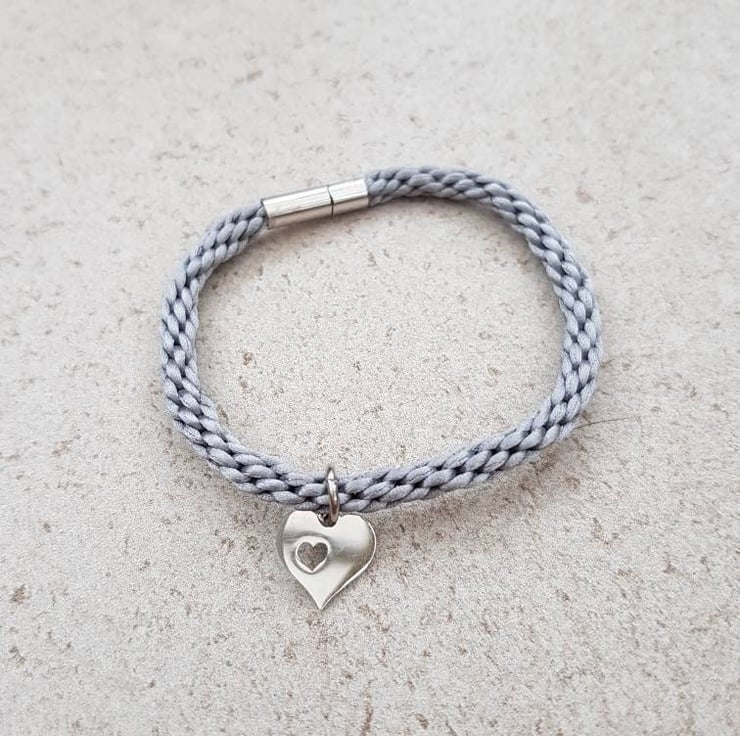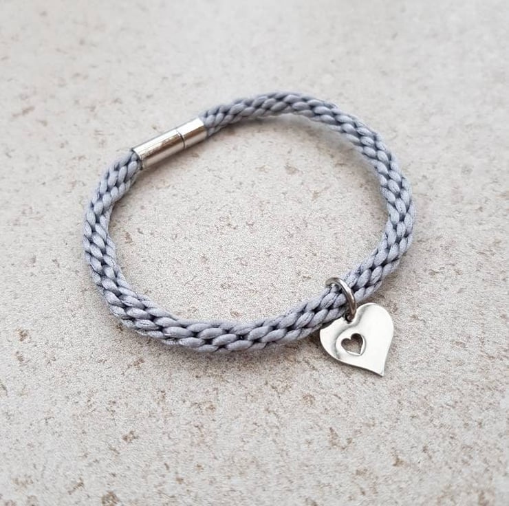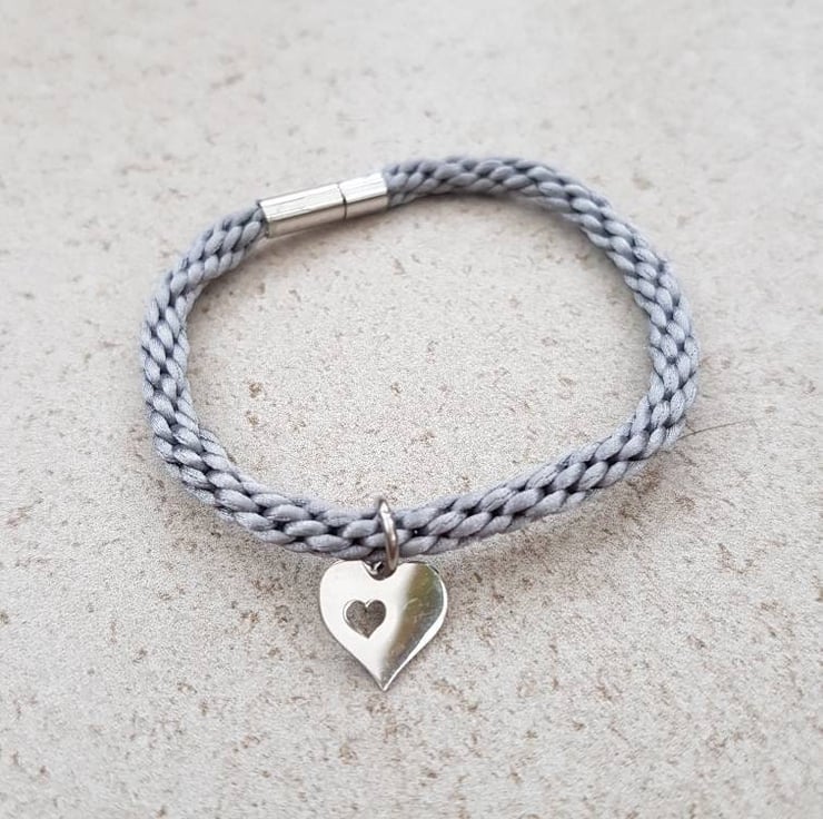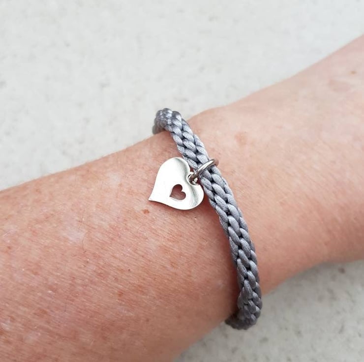 Hand braided with silky rattail cord and finished with a secure magnetic bayonet clasp. A pretty heart charm completes it.