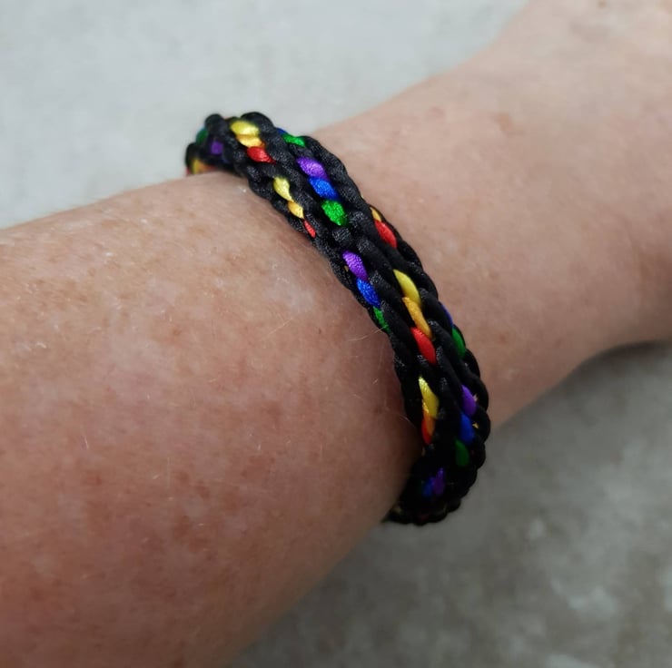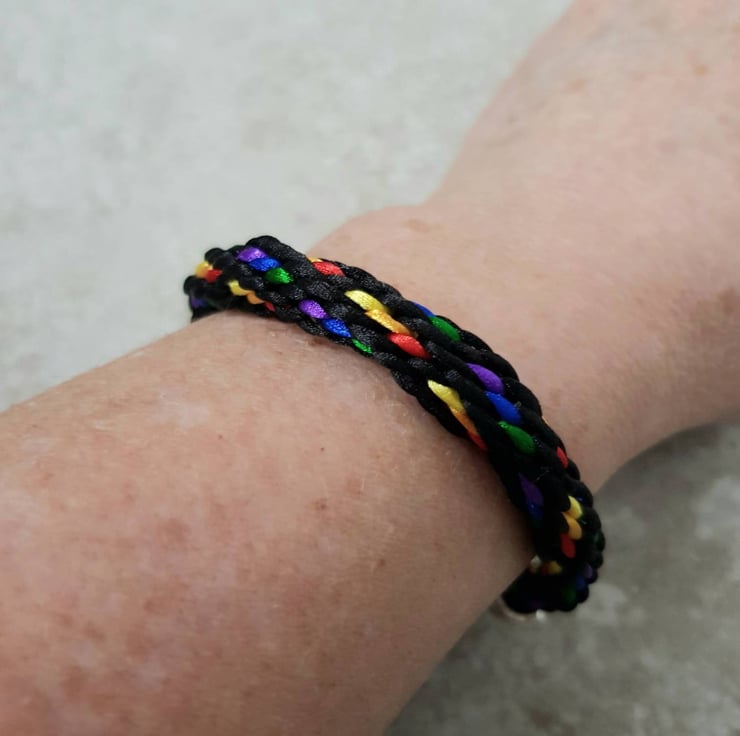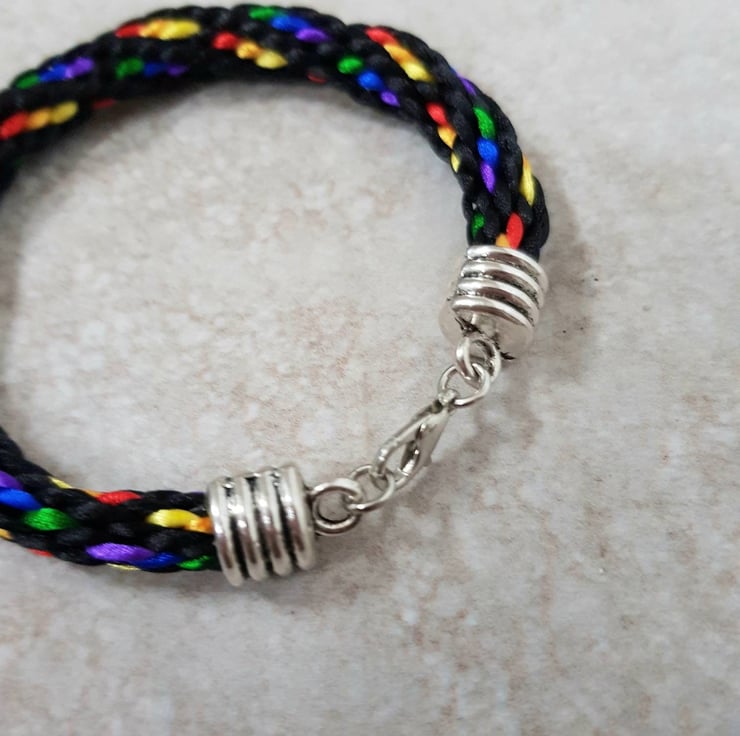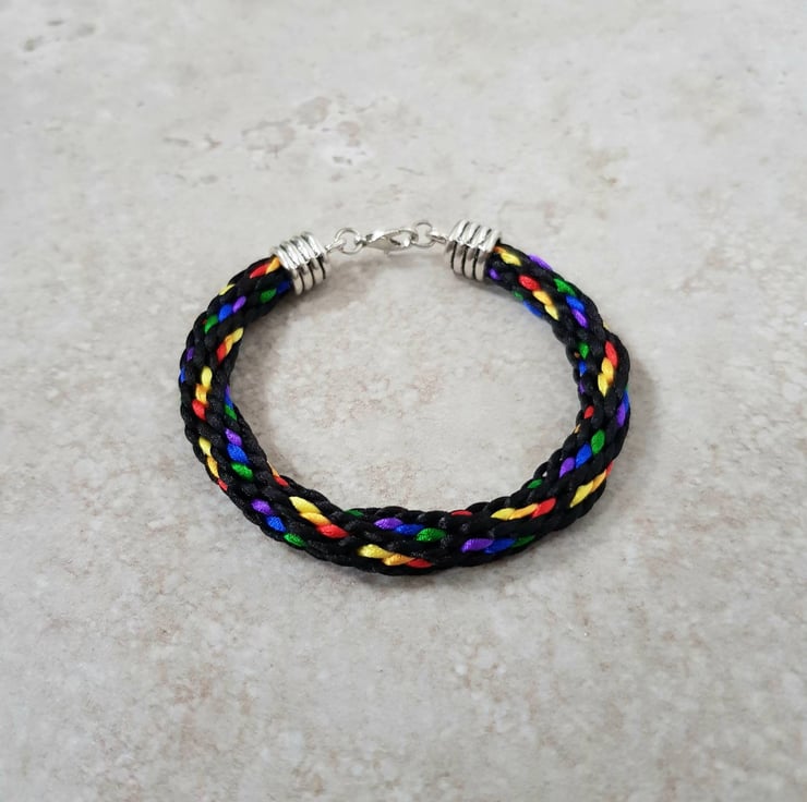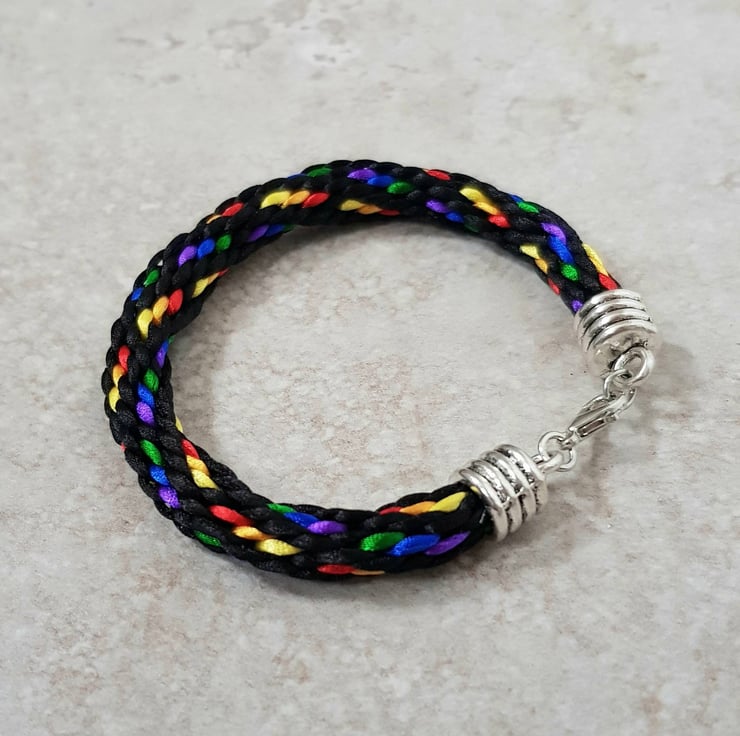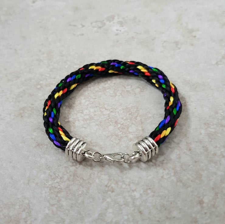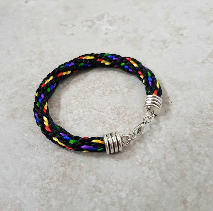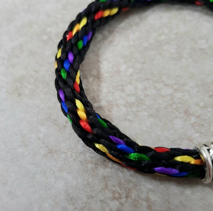 This beautiful black bracelet pops with a rainbow of colour. Handwoven with rattail silk cord and finished with a Tibetan silver lobster clasp.
