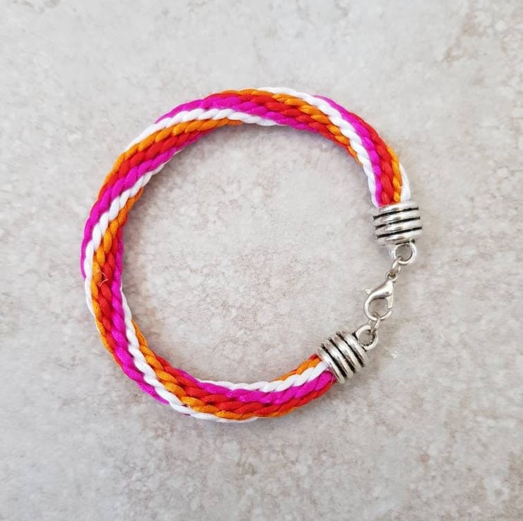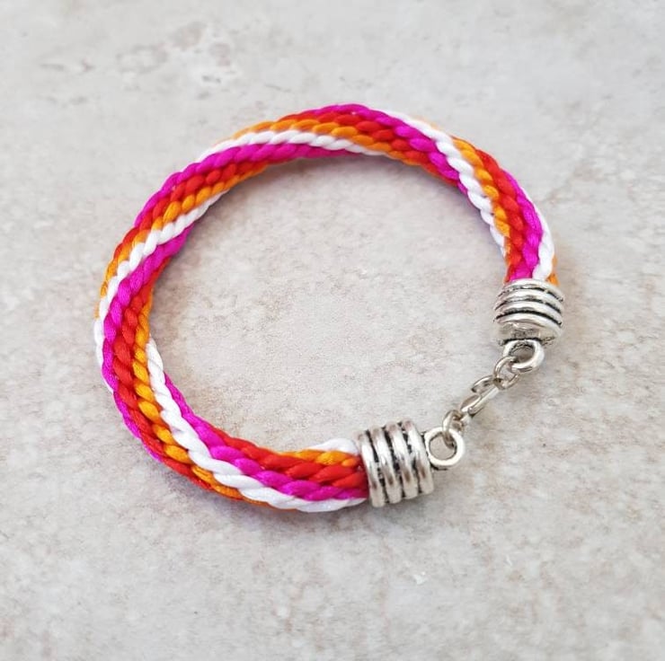 This colourful bracelet for women is handwoven in a pink,red, orange and white stripe pattern, with strands of rattail silk cord and finished with silver tone lobster clasp.