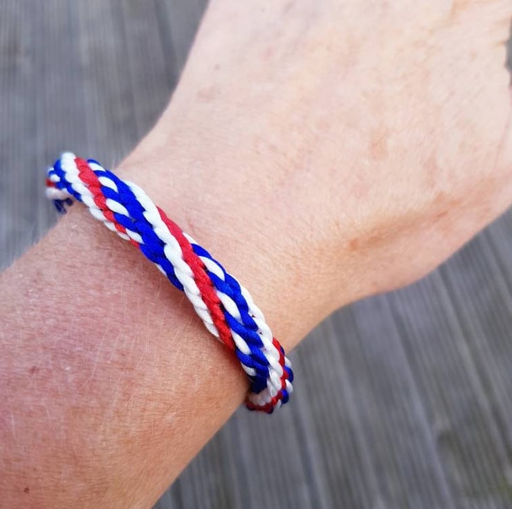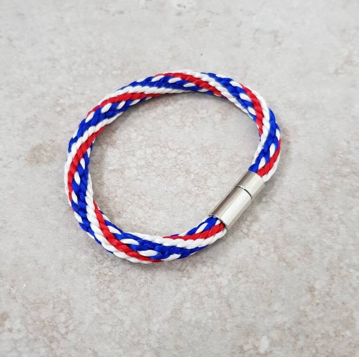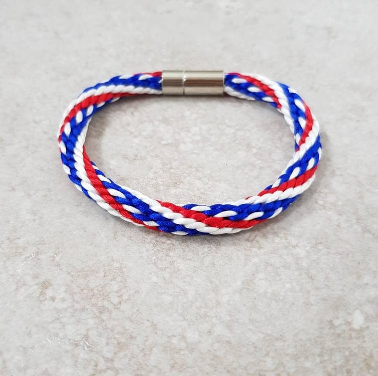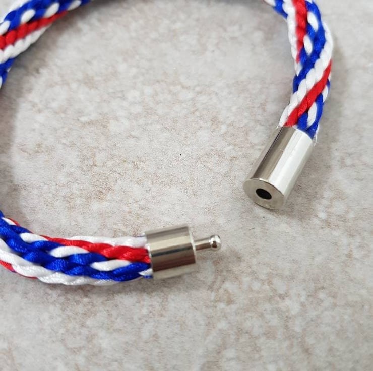 Hand woven with 16 strands of rattail silk and finished with a silver tone secure magnetic bayonet clasp. Easy to wear and perfect for 4th of July celebrations but looks great any time!