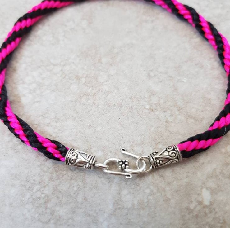 This colourful hot Pink and black Striped anklet is handwoven with 8 strands of silky satin cord and finished with a pretty silver tone Tibetan style 'S' hook clasp.