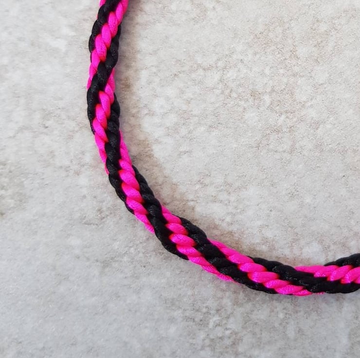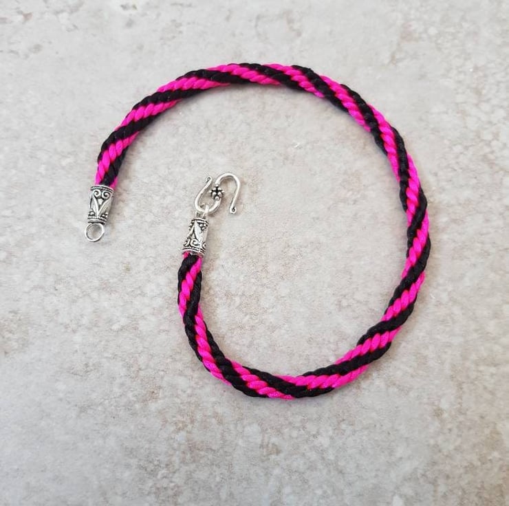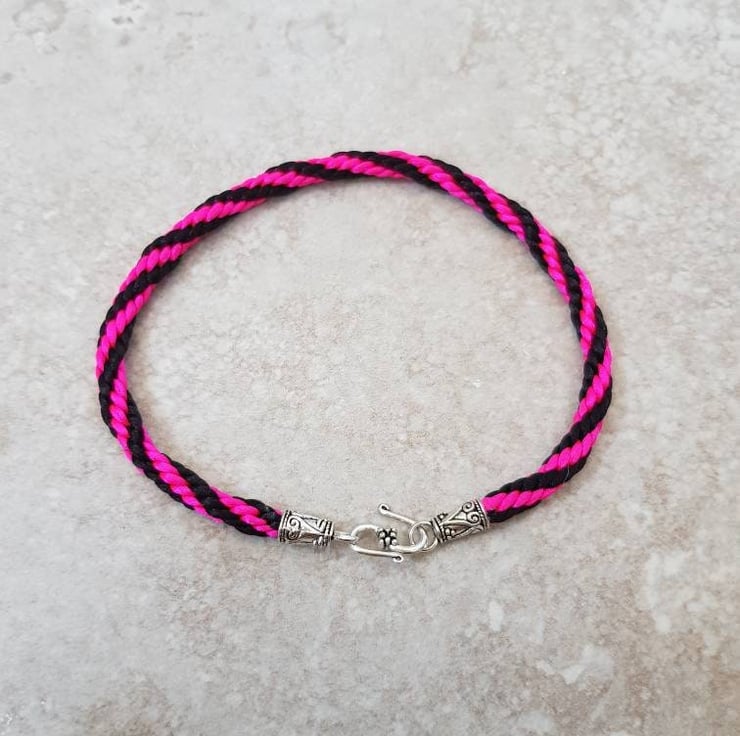 This colourful hot Pink and black Striped anklet is handwoven with 8 strands of silky satin cord and finished with a pretty silver tone Tibetan style 'S' hook clasp.