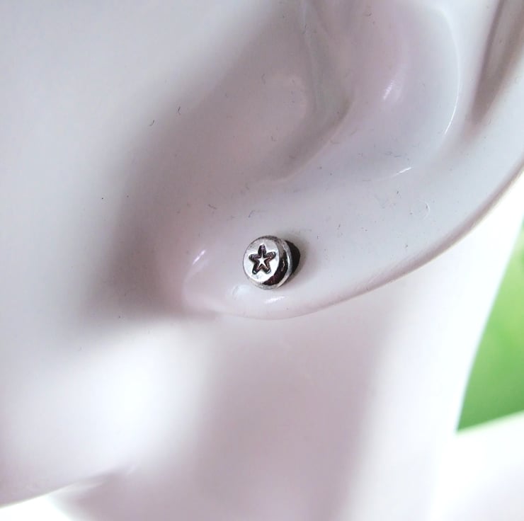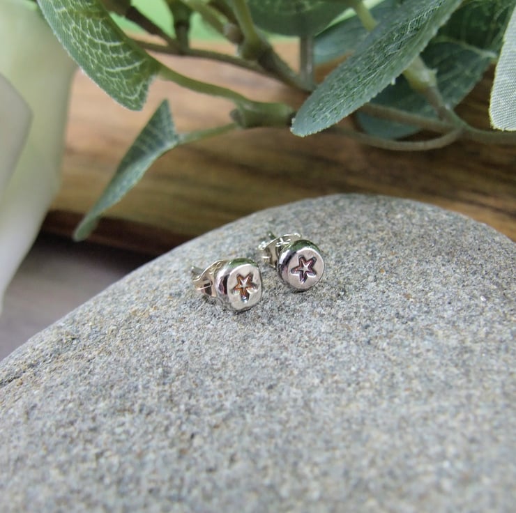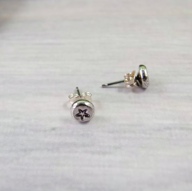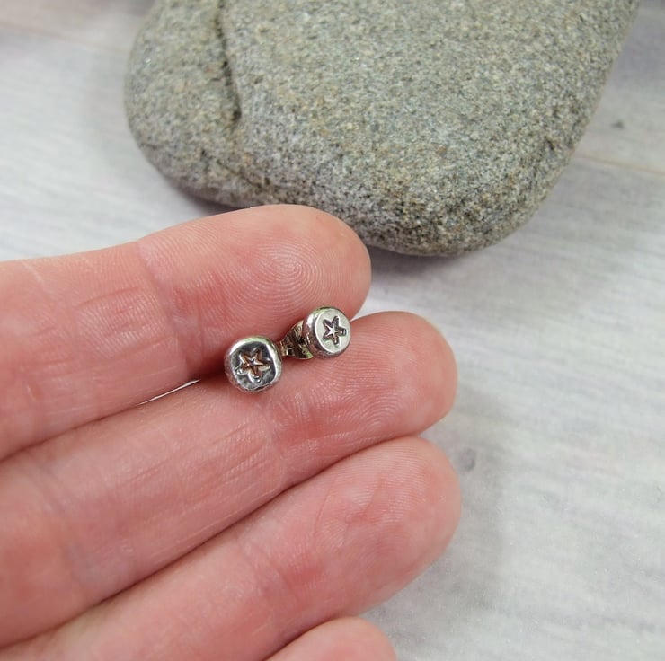 The little studs have been created from recycled sterling silver, heated to melting point to form a nugget then hand stamped with a litte star. Soldered to .925 sterling silver ear posts with butterfly backs.