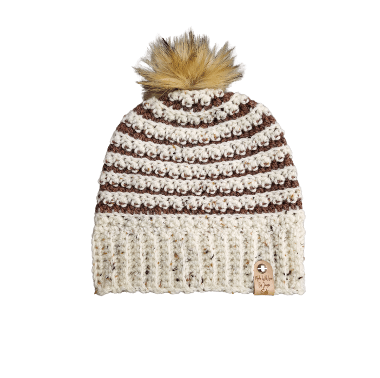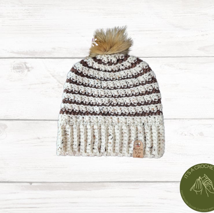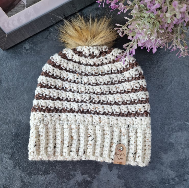 A handmade crocheted beanie with detachable faux fur pompom. Available in sizes adult & early teen size. This was made from a pattern by the designer Sea Star Crochet. It is called 'The Sea Star Havana Beanie'. It is made in an Aran yarn in the colours 'Glencoe' & 'Barley'. It can be done in both colours or one colour. The larger beanie in the pic is made from both colours. the smaller beanie is the early teen size and just for sizing. See my other listings for the yarn & colour choices. It can also have my personal tag which is 'Made with Love by Jayne' or my 'It's a crochet day' tag. Please specify when you order it.