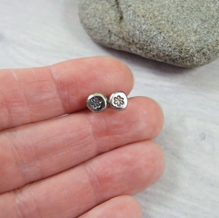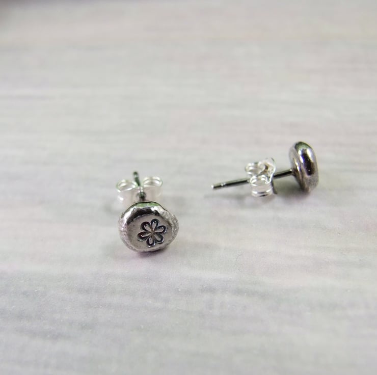 The little studs have been created from recycled sterling silver, heated to melting point to form a nugget then hand stamped with a litte flower. Soldered to .925 sterling silver ear posts with butterfly backs.