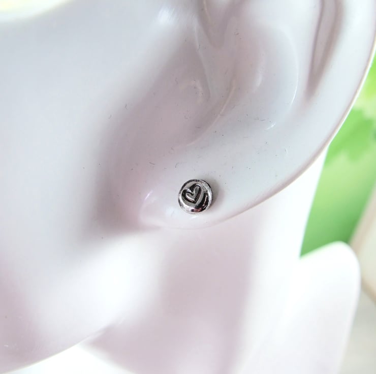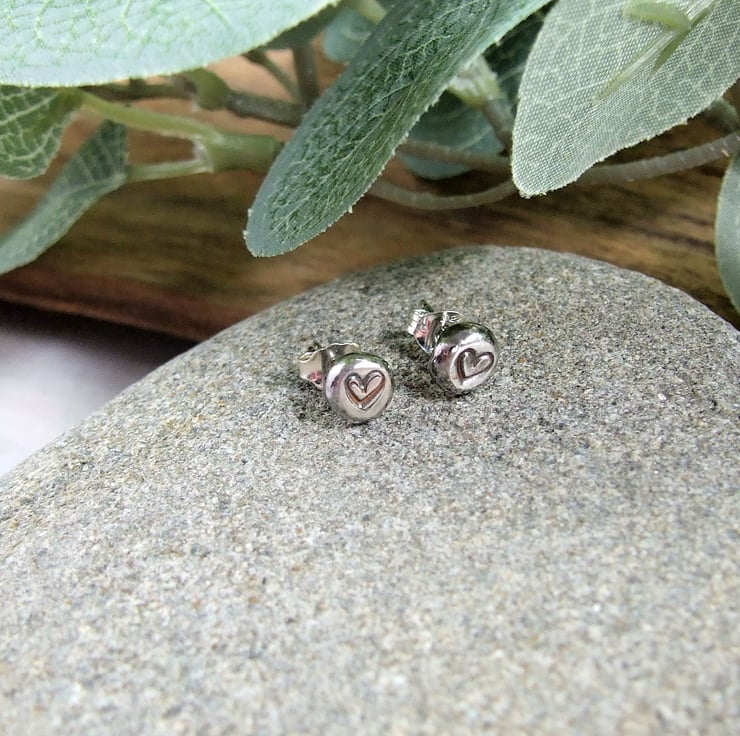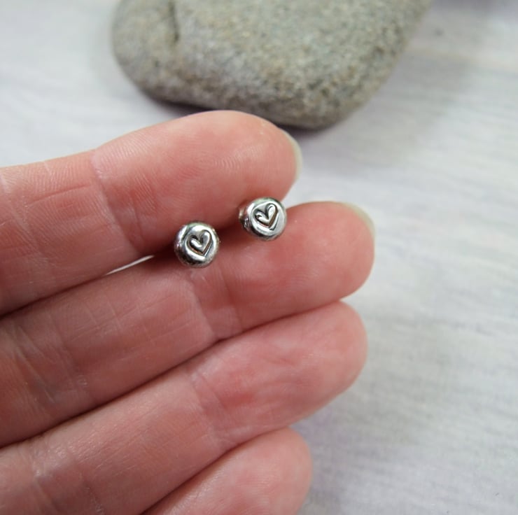 The little studs have been created from recycled sterling silver, heated to melting point to form a nugget then hand stamped with a litte heart. Soldered to .925 sterling silver ear posts with butterfly backs.