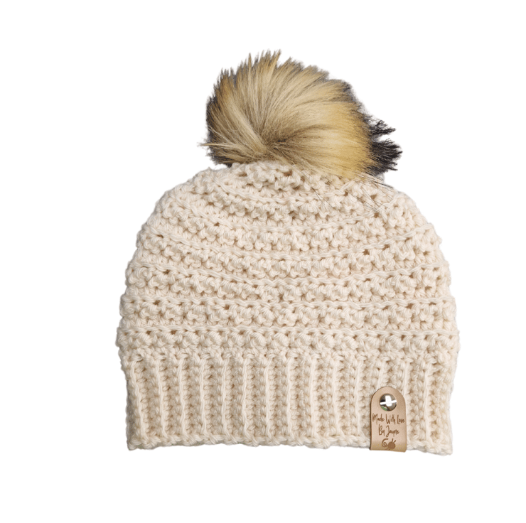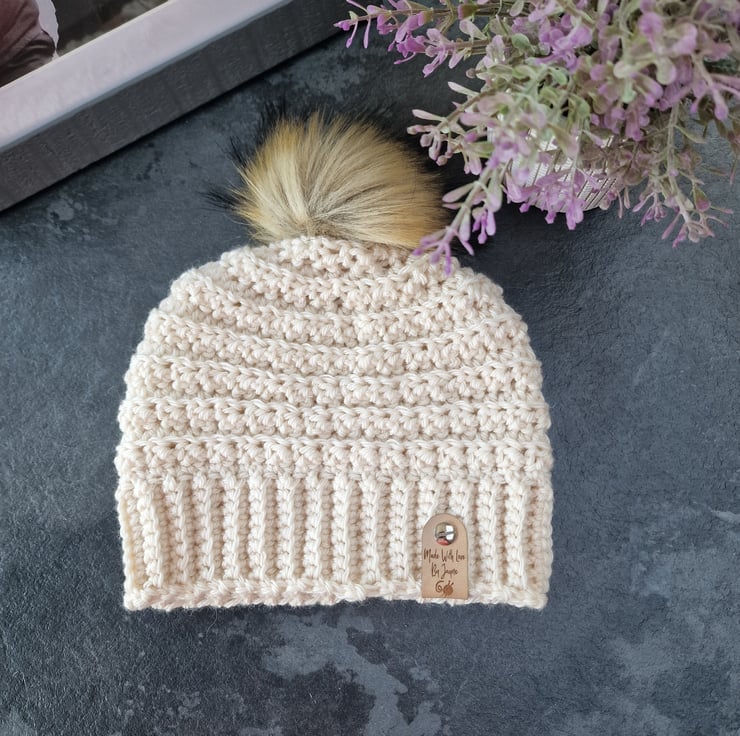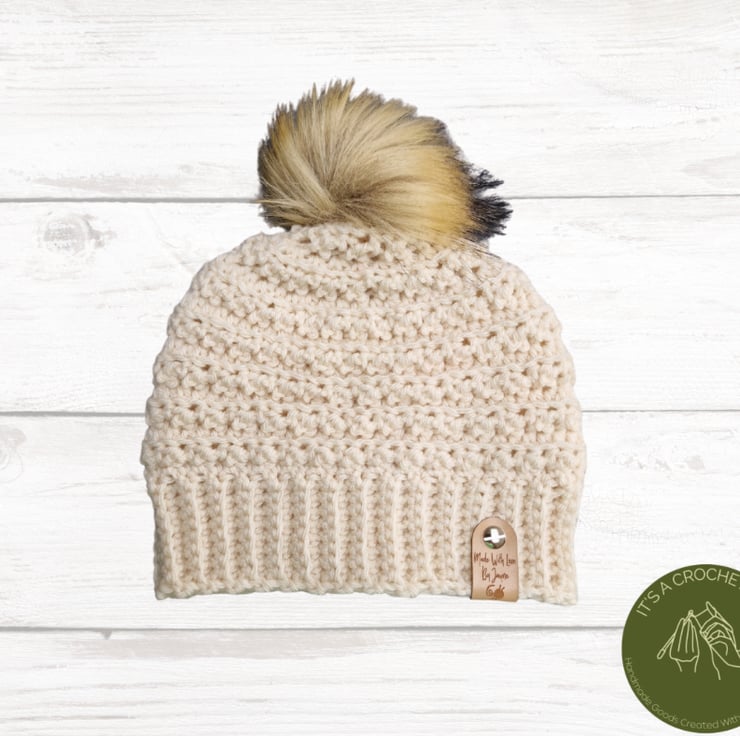 A handmade crocheted beanie with detachable faux fur pompom. Available in sizes adult, early teen, large child (6 plus), small child (3-6 yrs), toddler (18m-2yrs) & baby sizes. This is made from a pattern by the designer Sea Star Crochet. It is called 'The Sea Star Havana Beanie'. It is made in an Aran/Worsted yarn and available in various colours such as Denim, Parchment, Glencoe (Beige with flecks), Barley (Brown with flecks), Pink, Blue, Yelow, Mint Green, Clotted Cream, Fern, & Moss. Message me with required colour