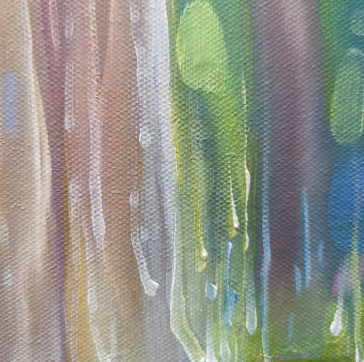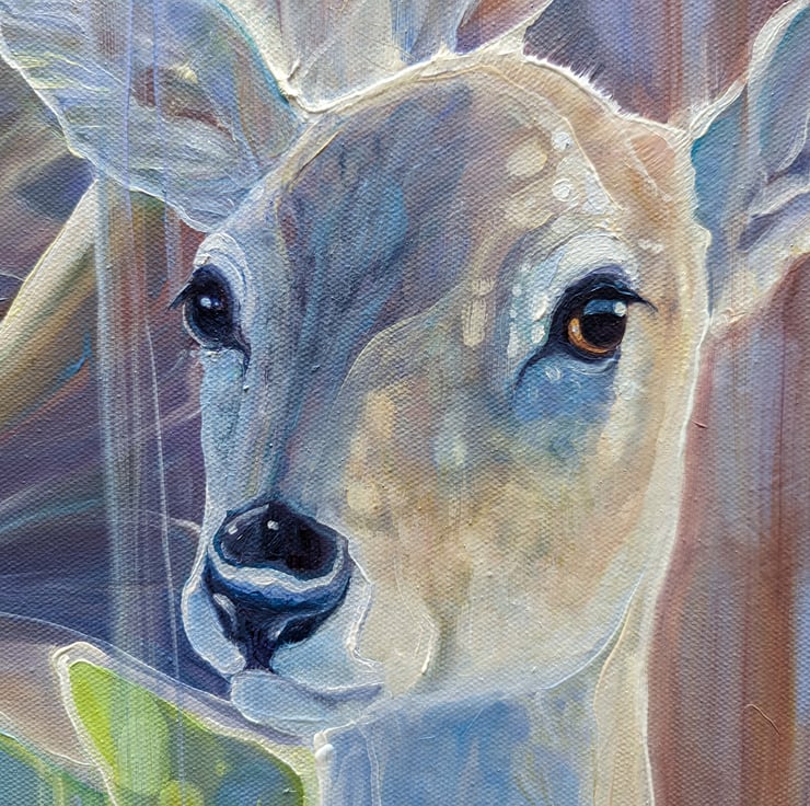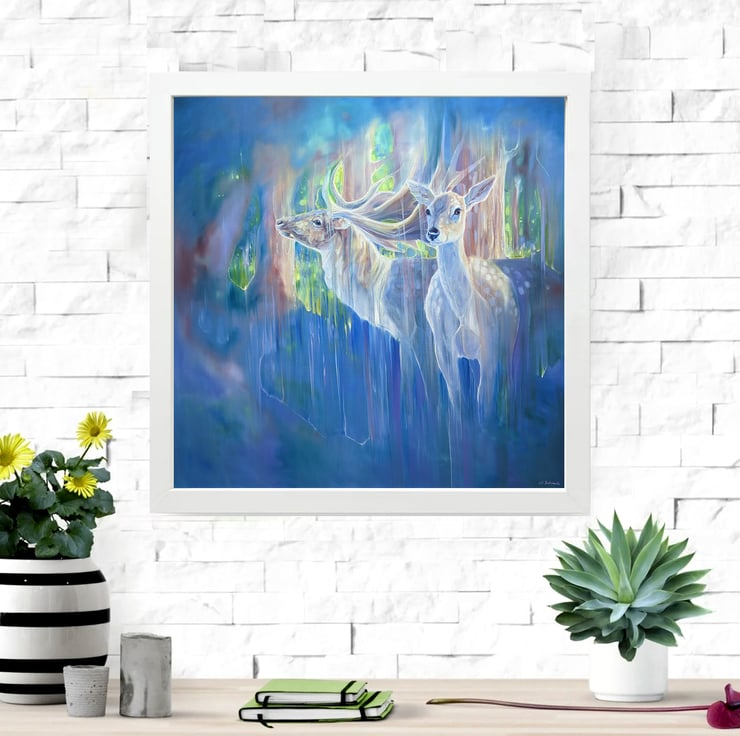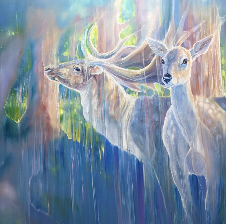 Divine Monarchs is a large semi-abstract wildlife painting of two deer in a bluebell wood in springtime. The painting was inspired by the months of April and May when the woodlands become carpeted in bluebells. I rarely spot deer in the forests as deer hide expertly, but in springtime it is easier to see them against the blues, lilacs and pinks of the flowers.