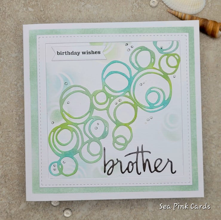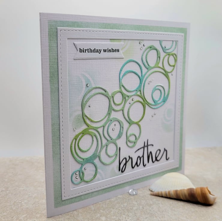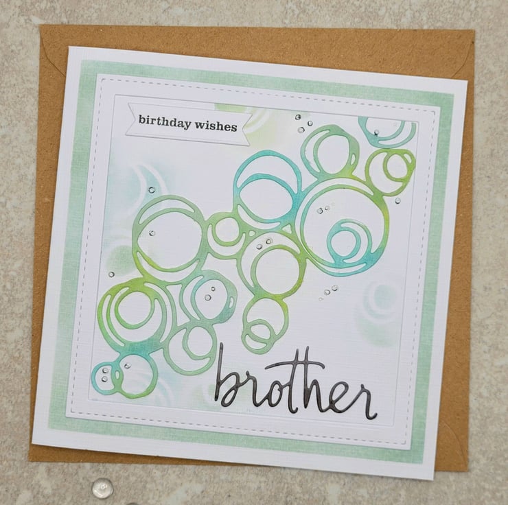 The card base is quality white 300 gsm linen card and archival inks in sage green, blue and jade have been used on the abstract design. Features include an ink blended frame, a white textured die-cut frame and a soft stencilled background. The abstract bubbles are die-cut and ink blended by hand, and the birthday wishes and brother are in charcoal grey ink. Tiny glossy 'bubbles' in white and charcoal grey complete the design of this original birthday card.