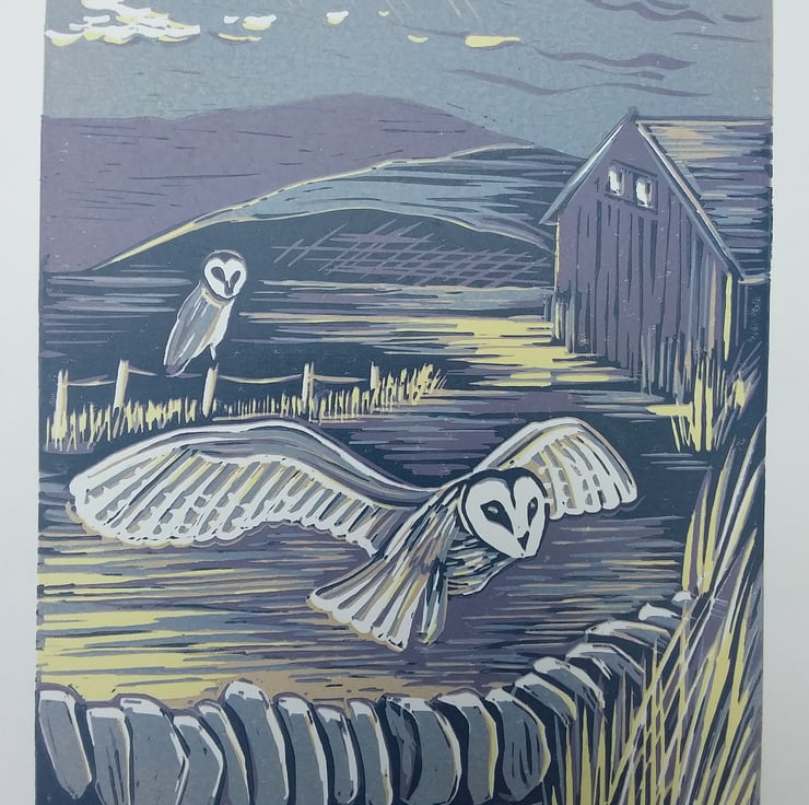 'Barn Owls at dusk' - a five colour reduction linoprint in mauve greys with pale yellow highlights.