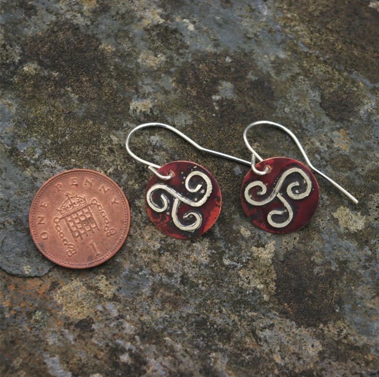 I have made and soldered a Celtic triple spiral design with sterling silver wire onto a copper disc with a diameter of 15mm/just over 0.5 inches. The copper has become richer in colour with heat and preserved by polishing with an impregnating wax.
