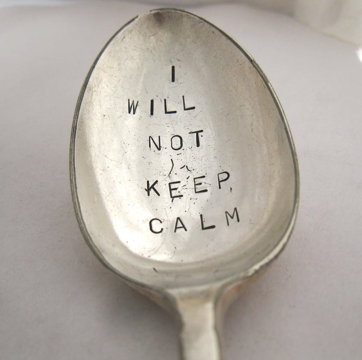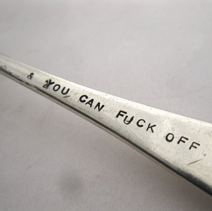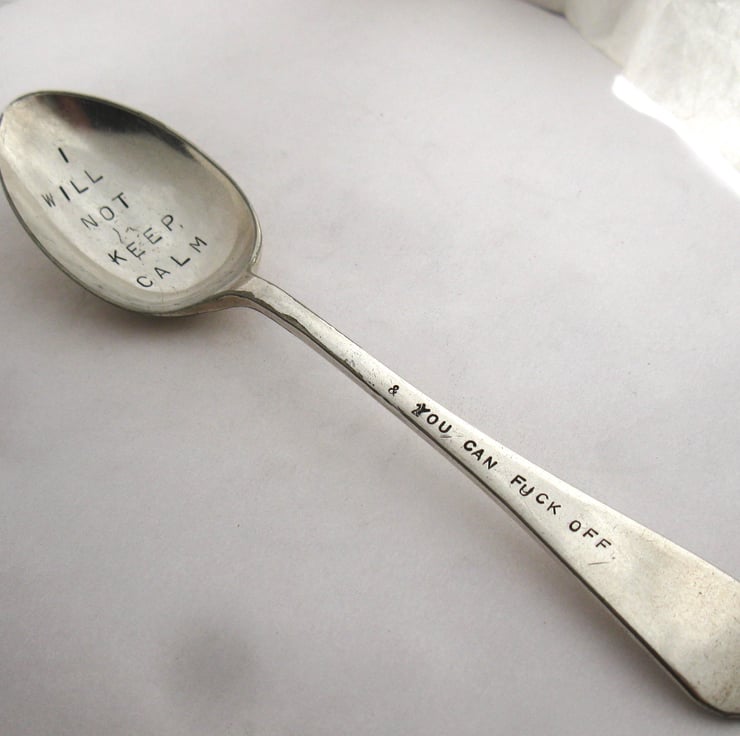A very rude handstamped 1940s vintage dessert spoon (approx. 18cm long). We are talking the F-word here: it says I WILL NOT KEEP CALM in nice clear 1940s vintage block lettering the bowl and then & YOU CAN F--K OFF on the handle in smaller but still very clear lettering. Not subtle, but to the point... the perfect gift for someone in the grip of menopausal rage, perhaps?