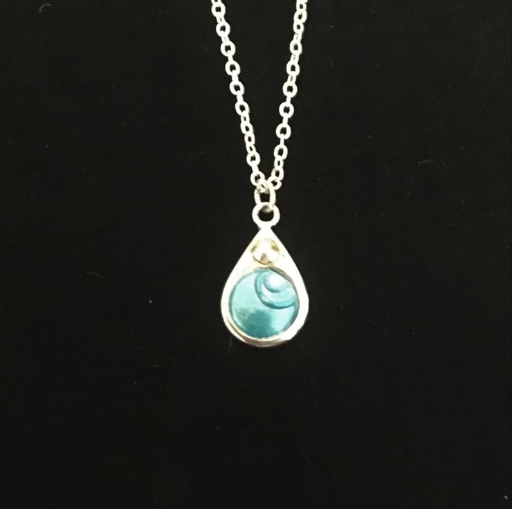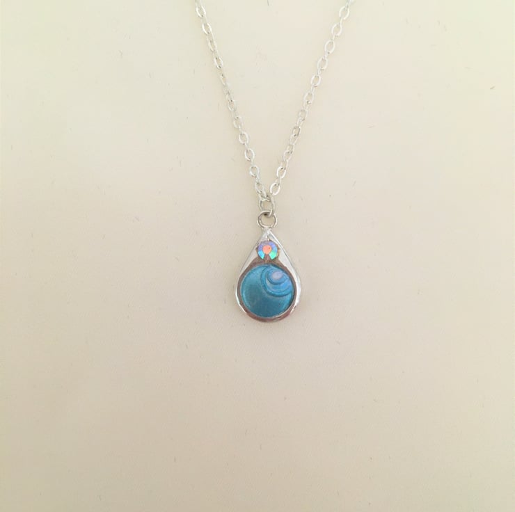 A sweet teardrop pendant with an azure centre in a quality silver plated setting.