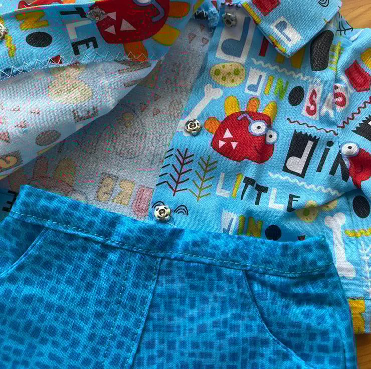 Shorts with side pockets, top and baseball cap. 3 items in this outfit, they all coordinate together. The top and cap are in a dinosaur print in bright blue, the shorts print is the same as the cap lining.