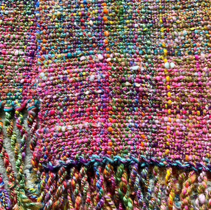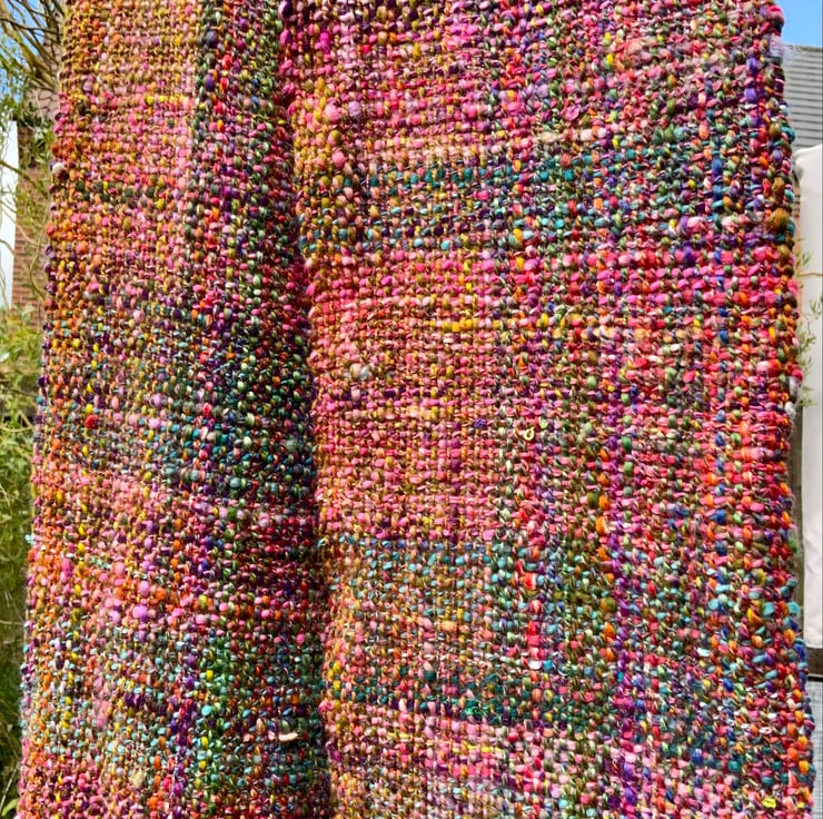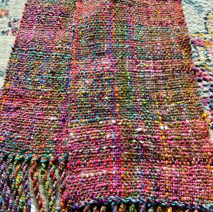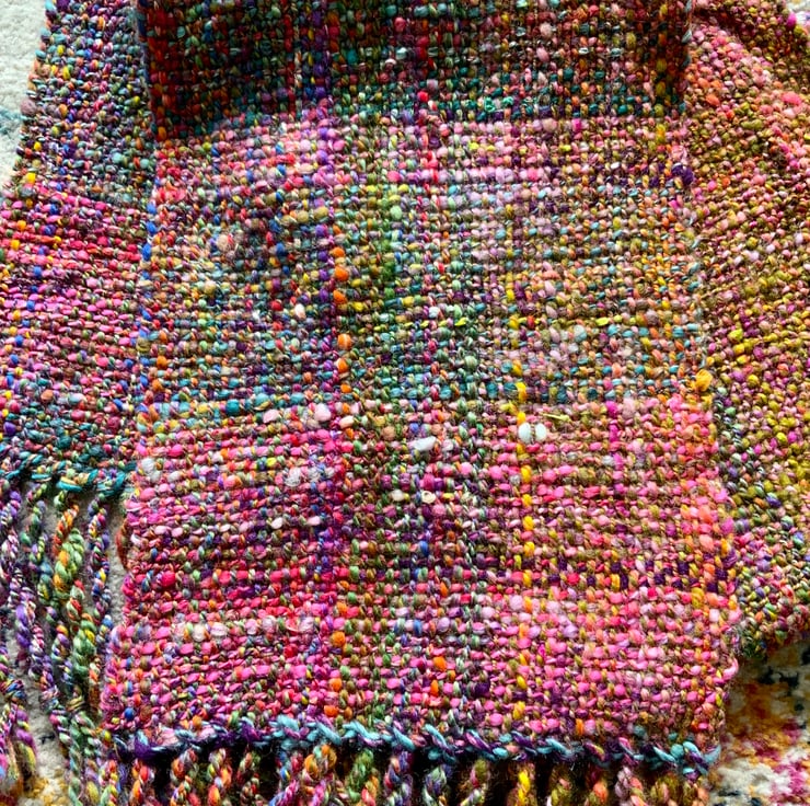 This is a hand woven scarf using yarn I have hand spun. It’s been woven on my rigid heddle loom and is 168cm x 20cm wide plus fringe which has been twisted. It is all pure British wool and is soft to touch. The colours are navy with turquoise, orange, green, pinks and plum. It’s a very pretty scarf and would go with lots of things, perfect for keeping you warm in the colder weather.