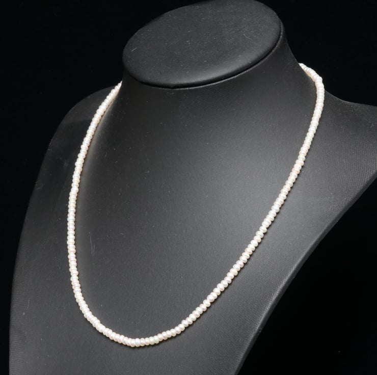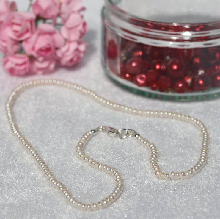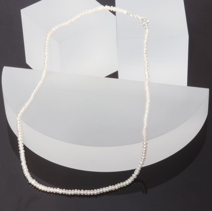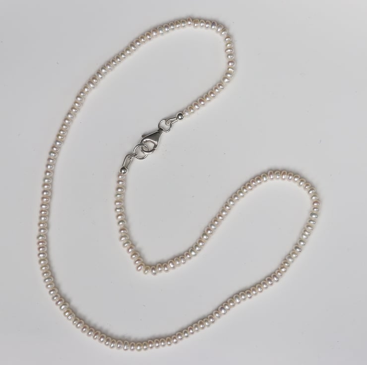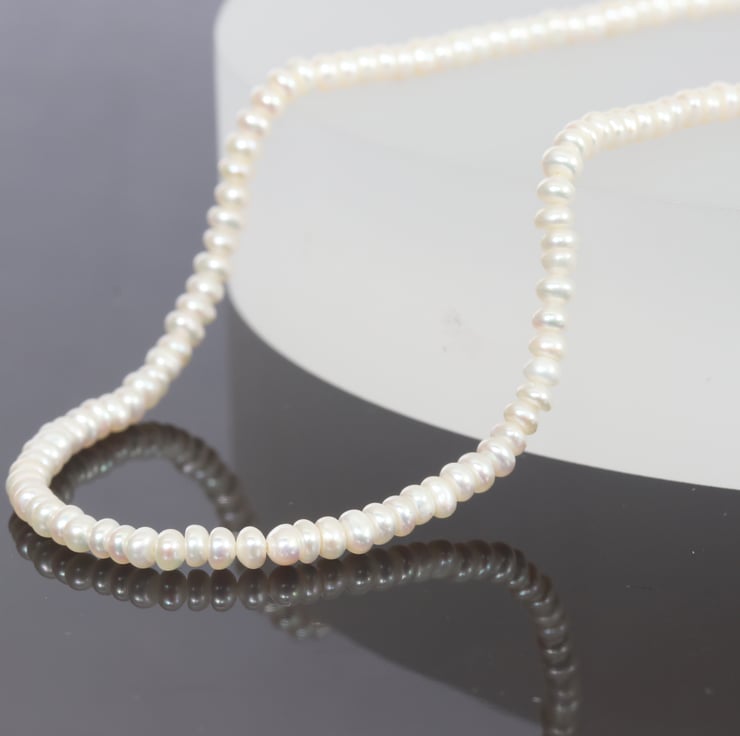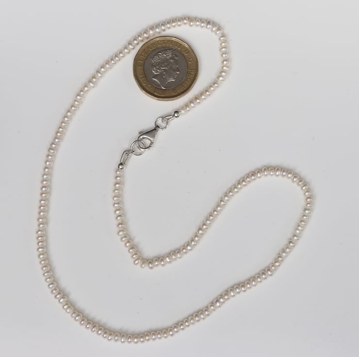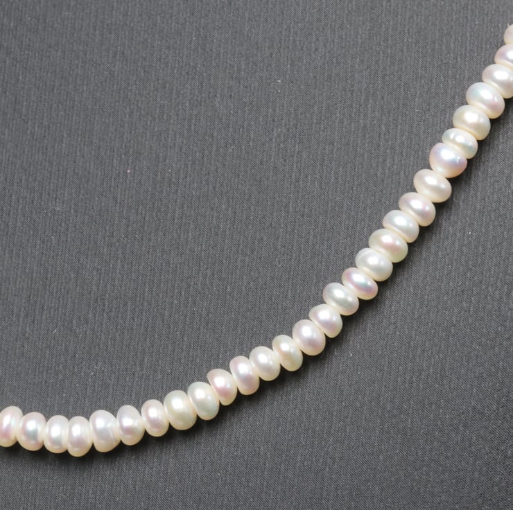 These sweet little pearls are really tiny; each one measures about 3mm wide by approximately 1.5mm. Most of them are dome shaped, they are white in colour with smooth surfaces and good lustre. They would be perfect for someone who likes tiny necklaces or who wants to treat themselves to some pearls without breaking the bank.