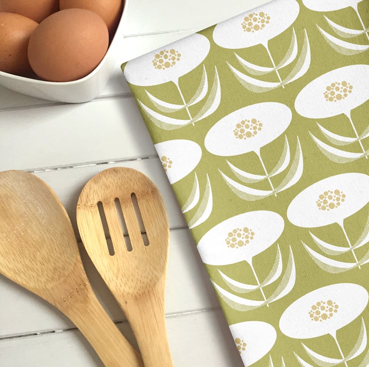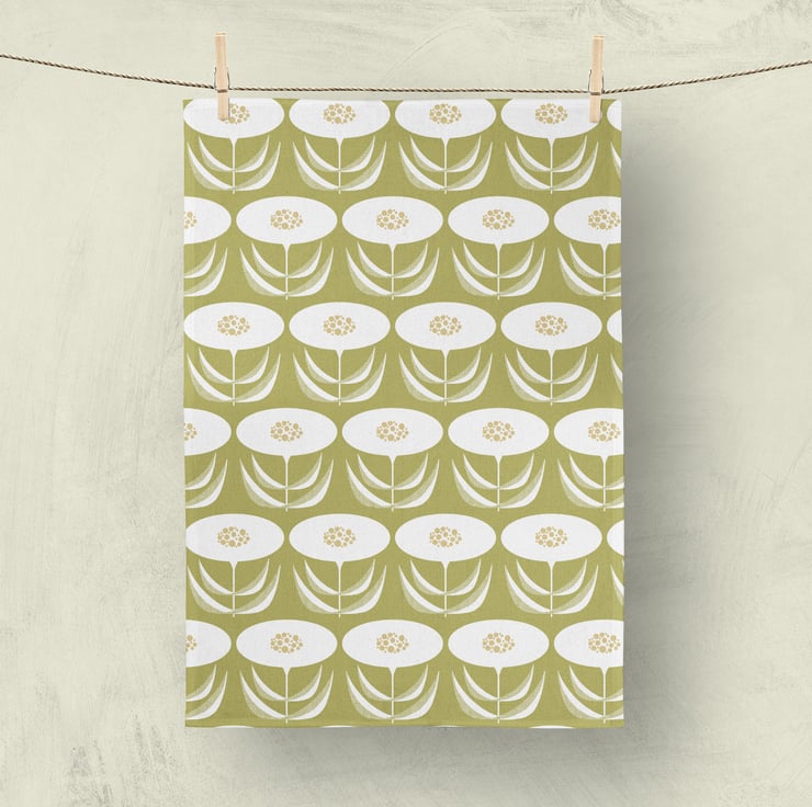 Olive Green Dandelion Flower Design Tea Towel.