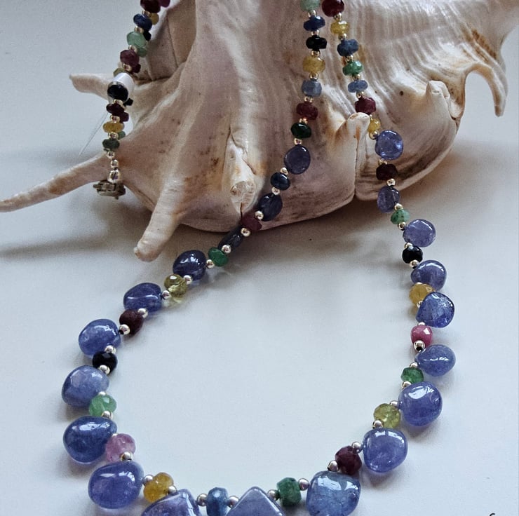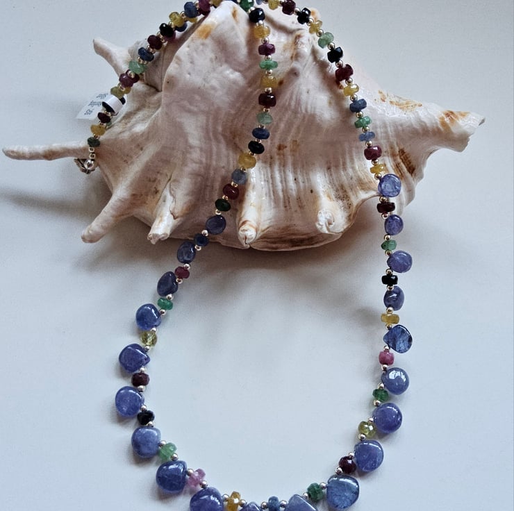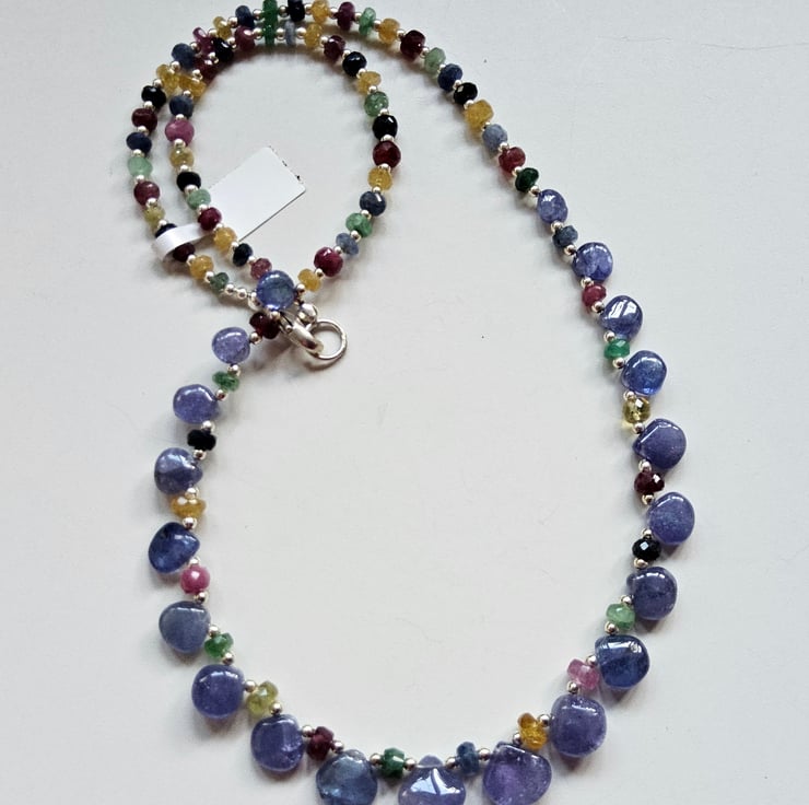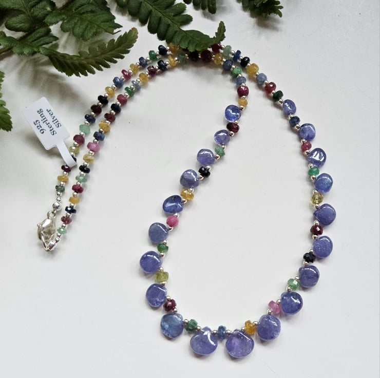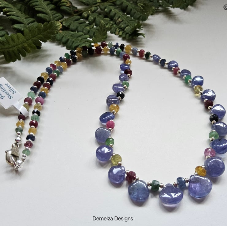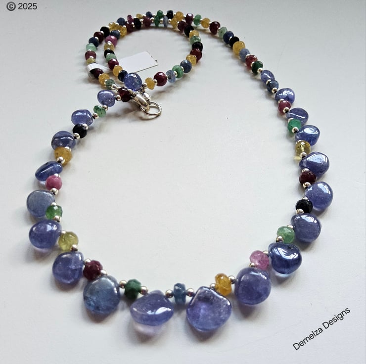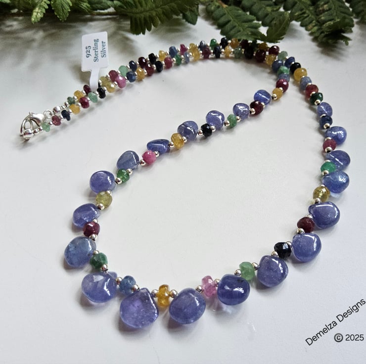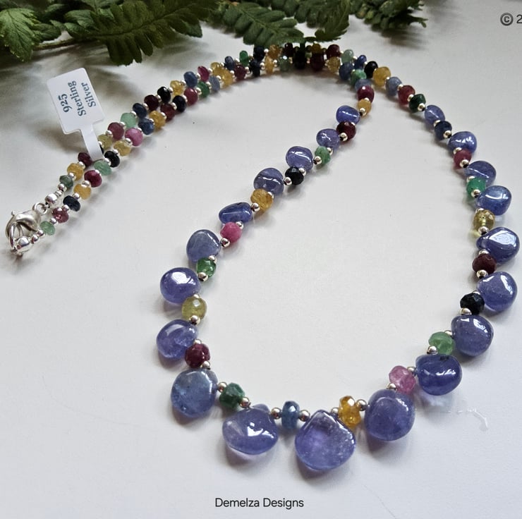 The item has AAA cabochon cut genuine tanzanite smooth pear drops and faceted rondelle cut sapphires, ruby and emeralds. Between the pear drops are 2mm sterling silver beads adding sparkle during wear and an opulent finish to the design.