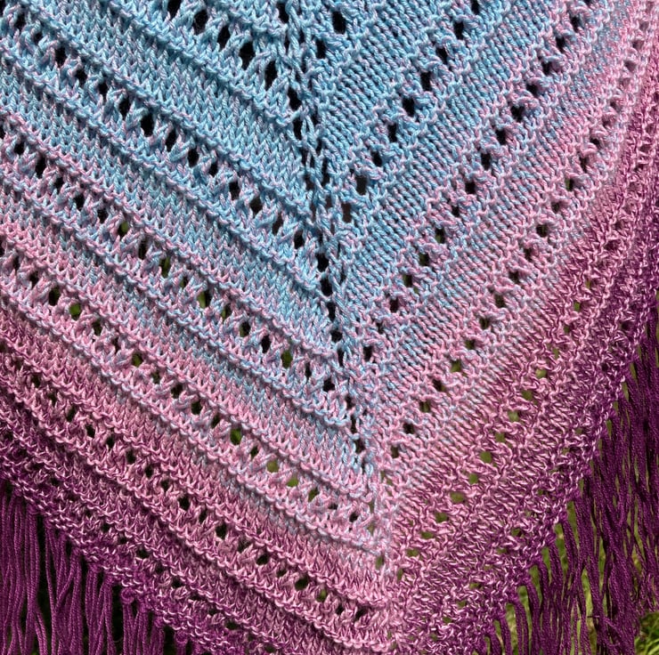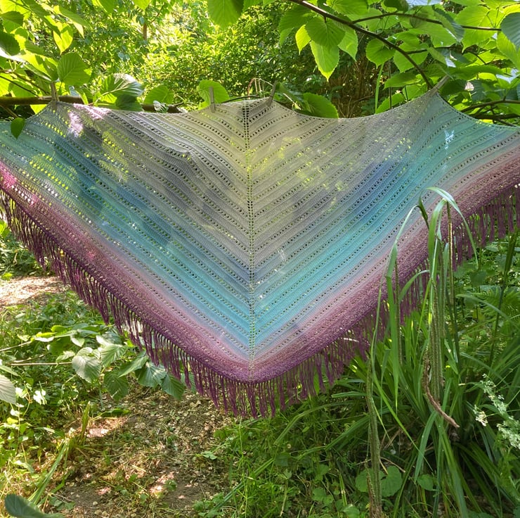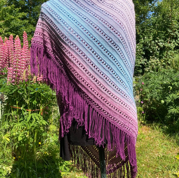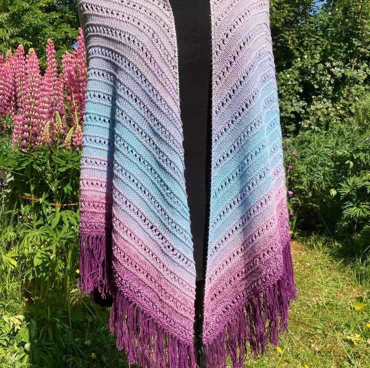 Shawl depth (neck to point) is 108 cm including the fringe. Shawl width is 220cm including the fringe.