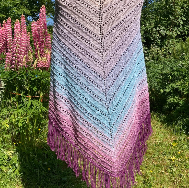 Fringed shawl is hand knitted in a variegated umbre cotton mixed yarn. The shawl drapes softly around the shoulders and flows with movement.