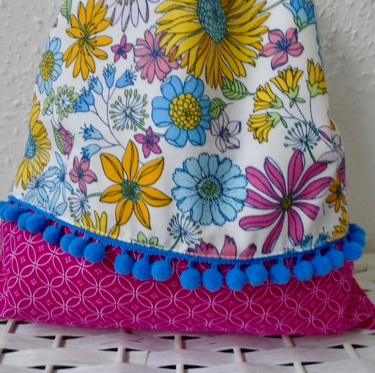 Made in a couple of lovely printed cotton fabrics , and embellished with a pom pom trim on the front .
