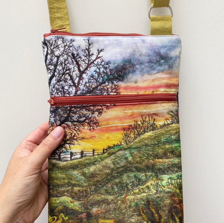 This beautiful useful zip bag is decorated with a print of one of my embroidered wet felt pieces. The design shows a sunrise behind the silhouette of a tree on a hill. It’s cotton lined inside and has a matching coloured zip with a long adjustable strap. The print is on the front and back.