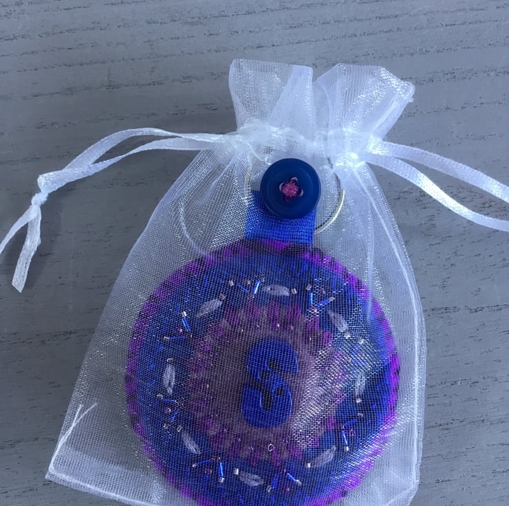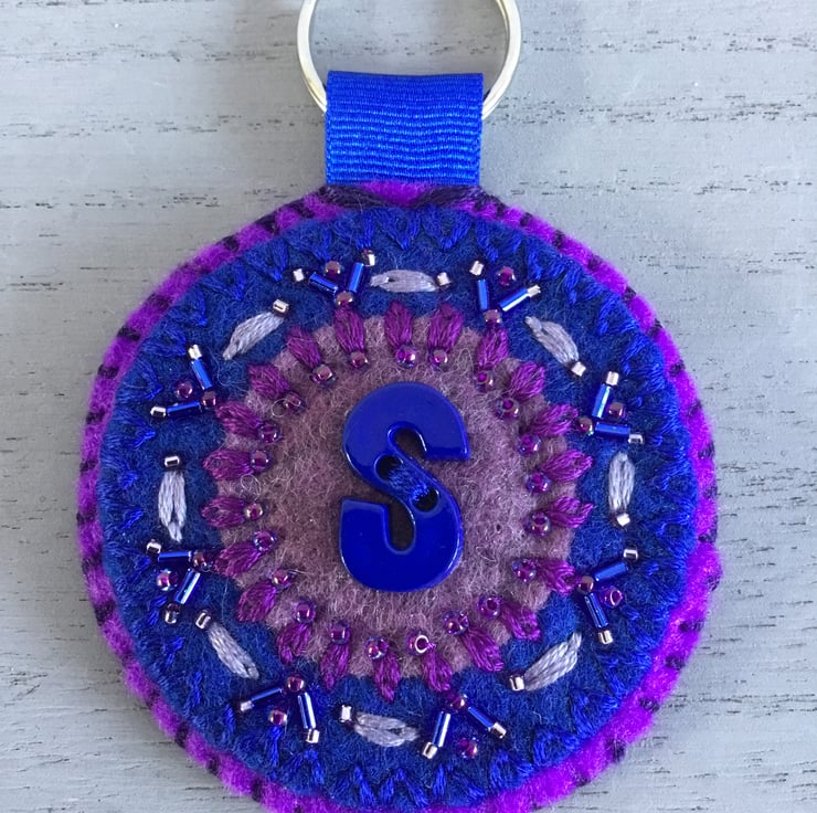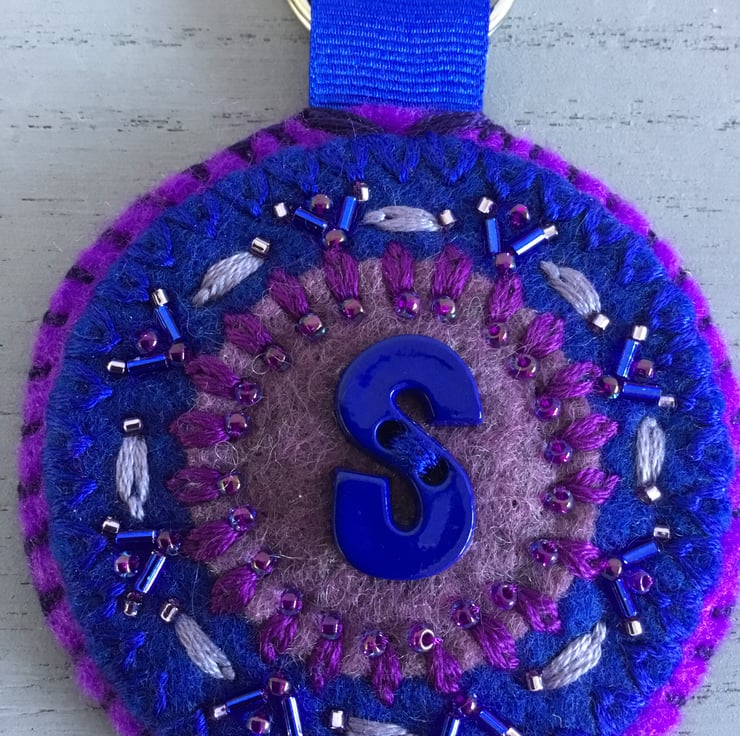 This Hand Embroidered Letter Keyring or Bag Charm has a letter S button stitched onto circles of dusty pink, blue and purple felt……hand embroidered with Lazy Daisy Stitches, seed and bugle beads in grey, blue and purple. A bespoke letter S can represent someone’s name…….Susan, Sharon, Steve, Simon, Sister…..
