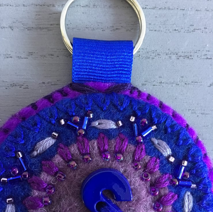 This hand embroidered keyring or bag charm is 2.50 inches (6 cms) in diameter. A split metal pin is attached at the top with a blue ribbon…….ready to attach a key or accessorise a bag.