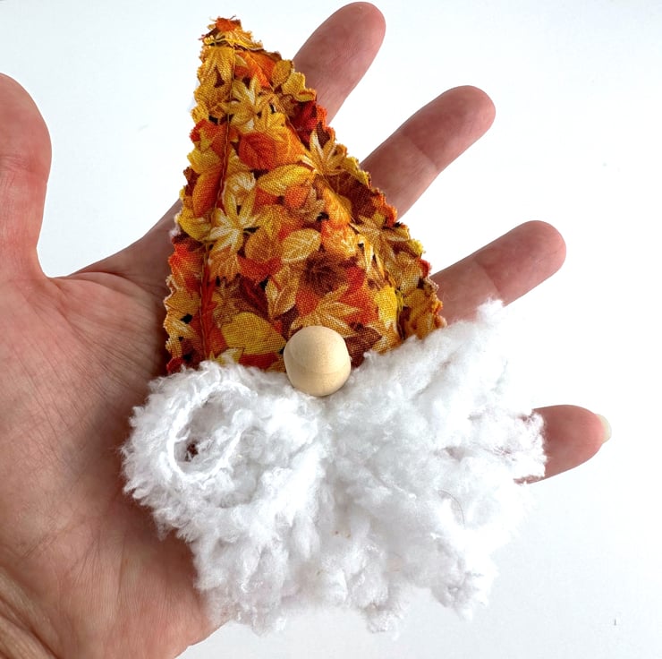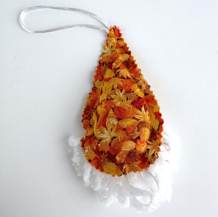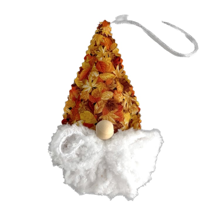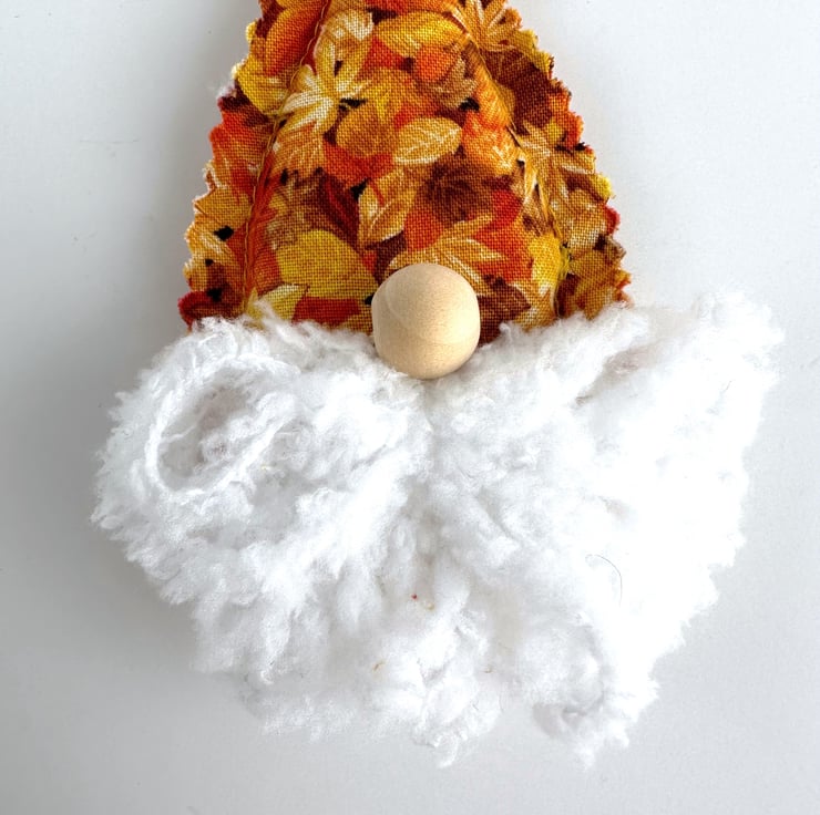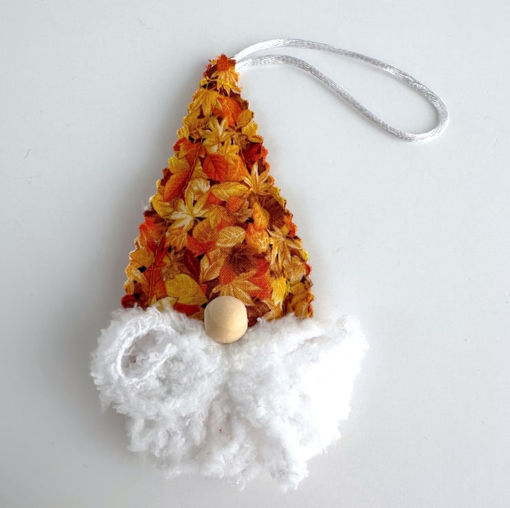 Autumn leaves gnome hanging decoration. This cute Scandi gnome decoration is made from gorgeous fabric with a print pattern of Autumn leaves in shades of golden yellow, burnt orange and russet brown. He has a beard made from white snuggly chunky yarn, and a natural wood bead nose. The hat fabric has pinked edges to give a raw scalloped finish. The decoration is lightly padded with polyester hollow fibre filling and has a hanging loop made from white satin cord.
