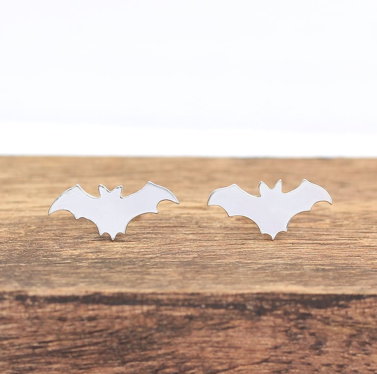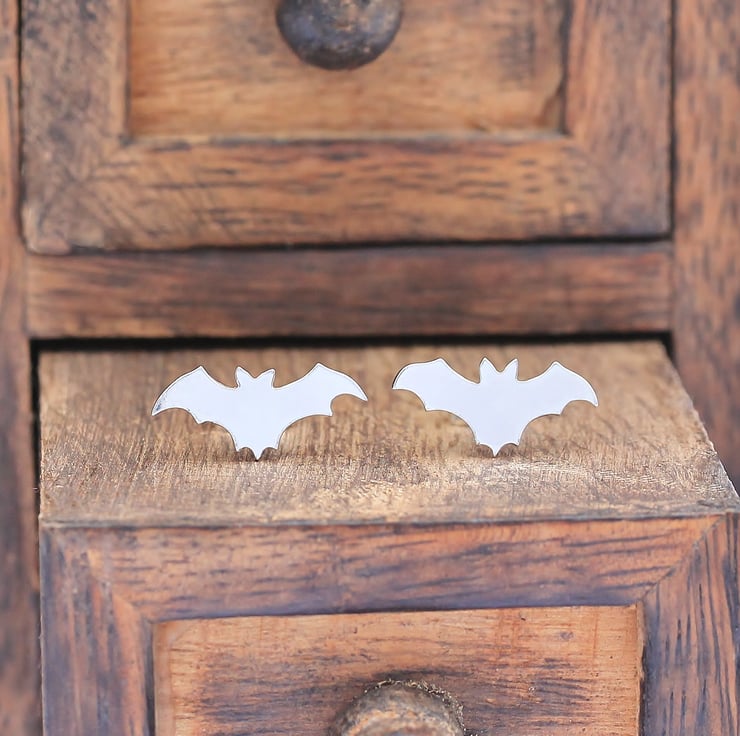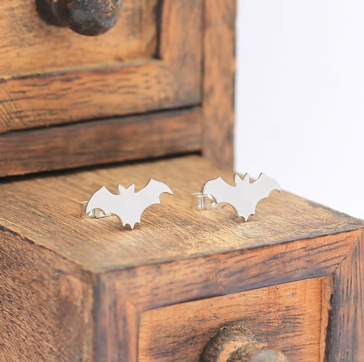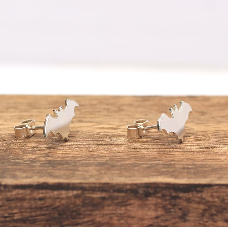 A pair of sterling silver bat stud earrings. A cute pair of woodland-inspired stud earrings, perfect to wear every day! Ideal for Halloween!